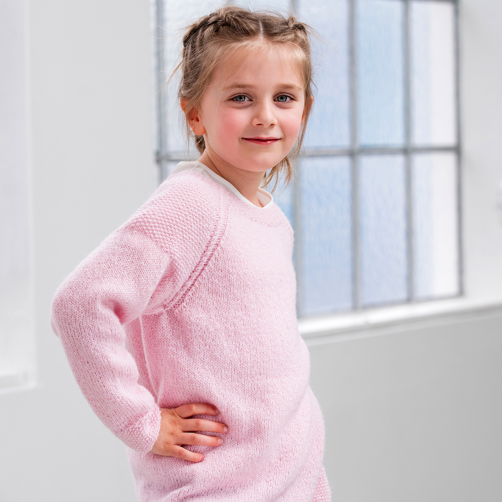 Alva genser er her vist i fargen lys rosa 316116. Ask ullgarn finnes i 100 flotte farger.
