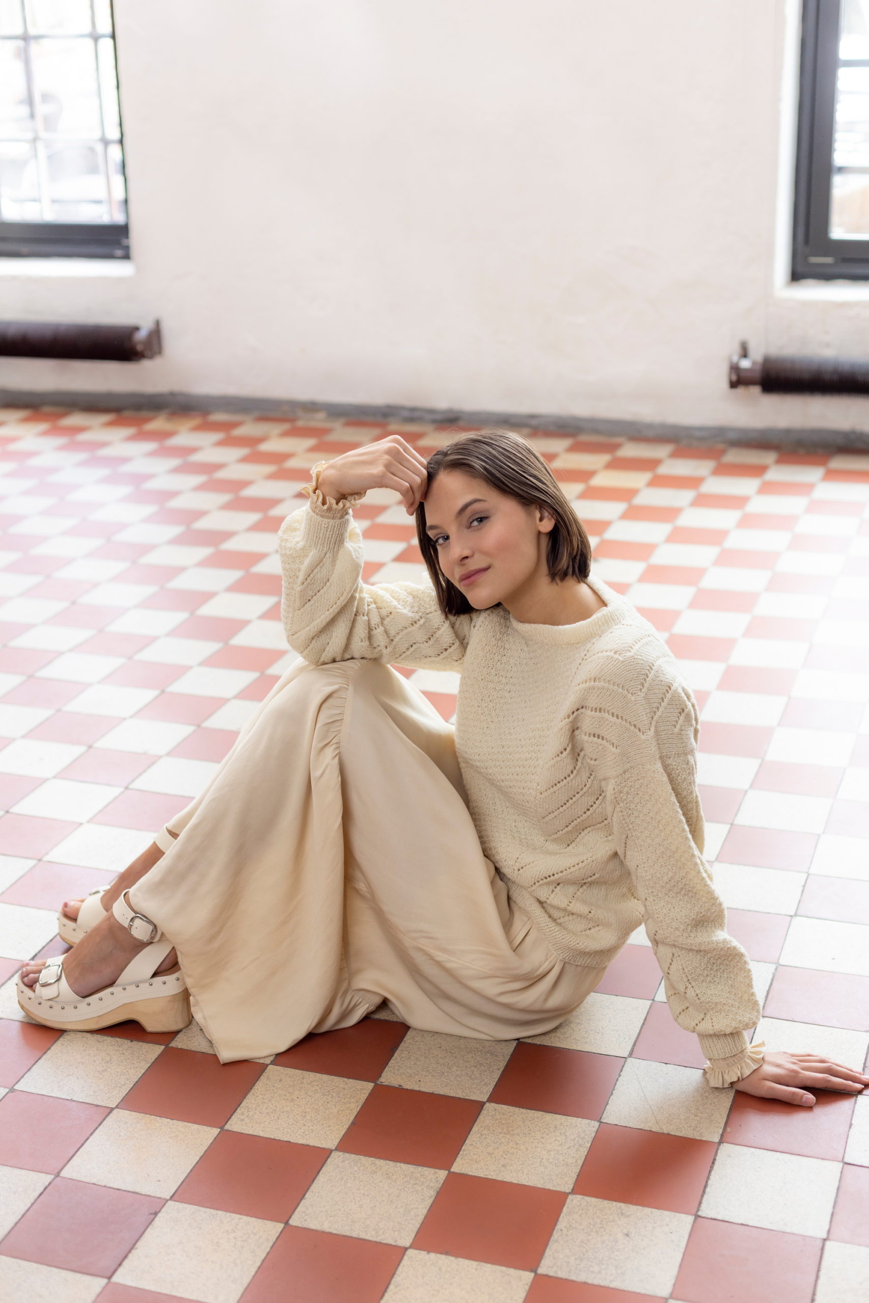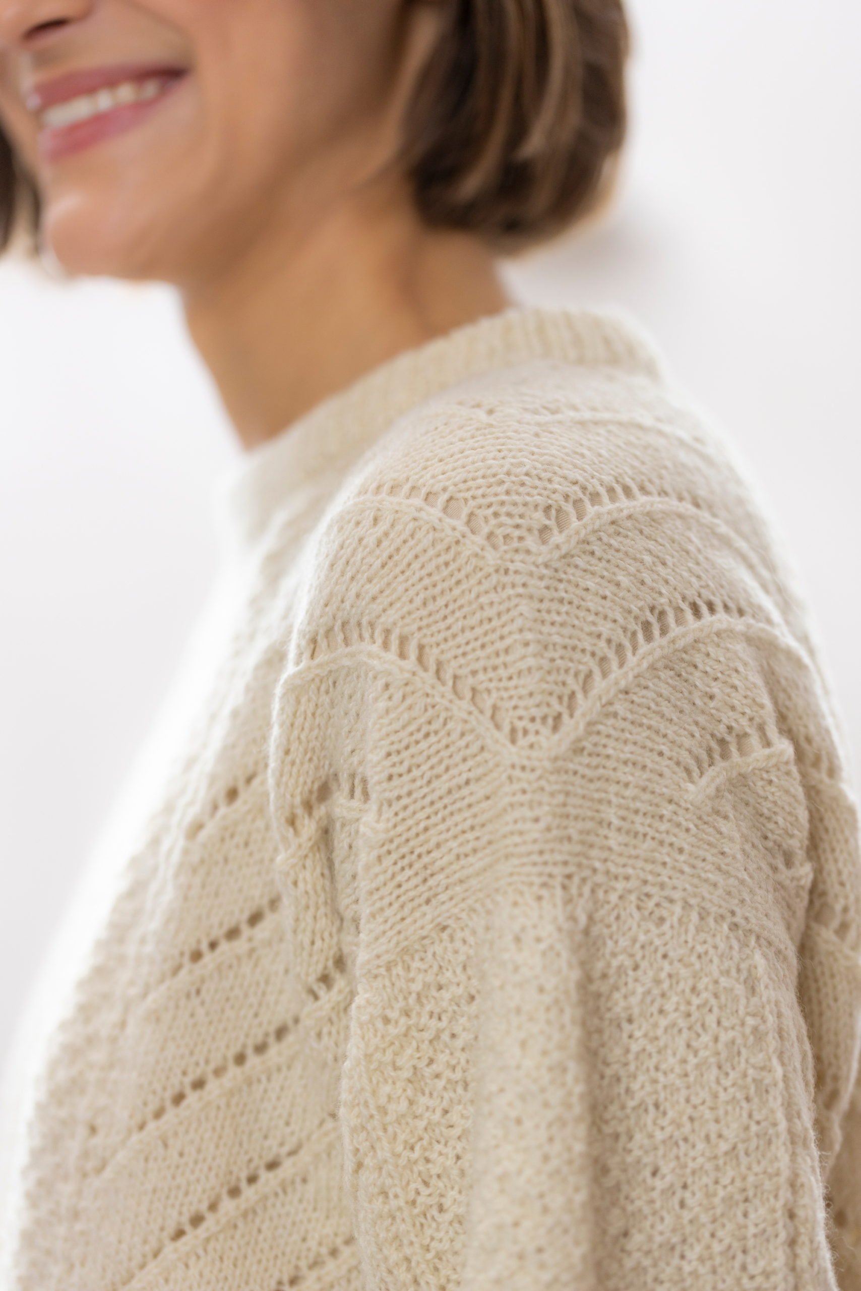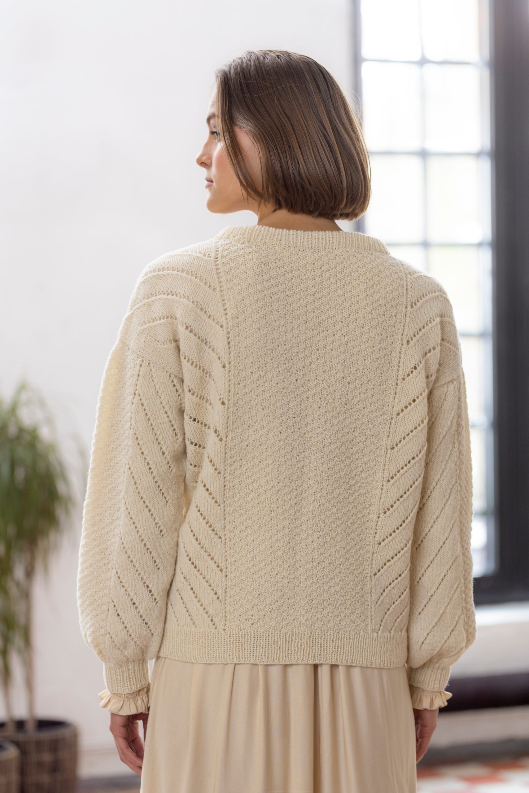 Strukturstrikket genser i Vilje lamullgarn. Genseren strikkes nedenfra og opp.