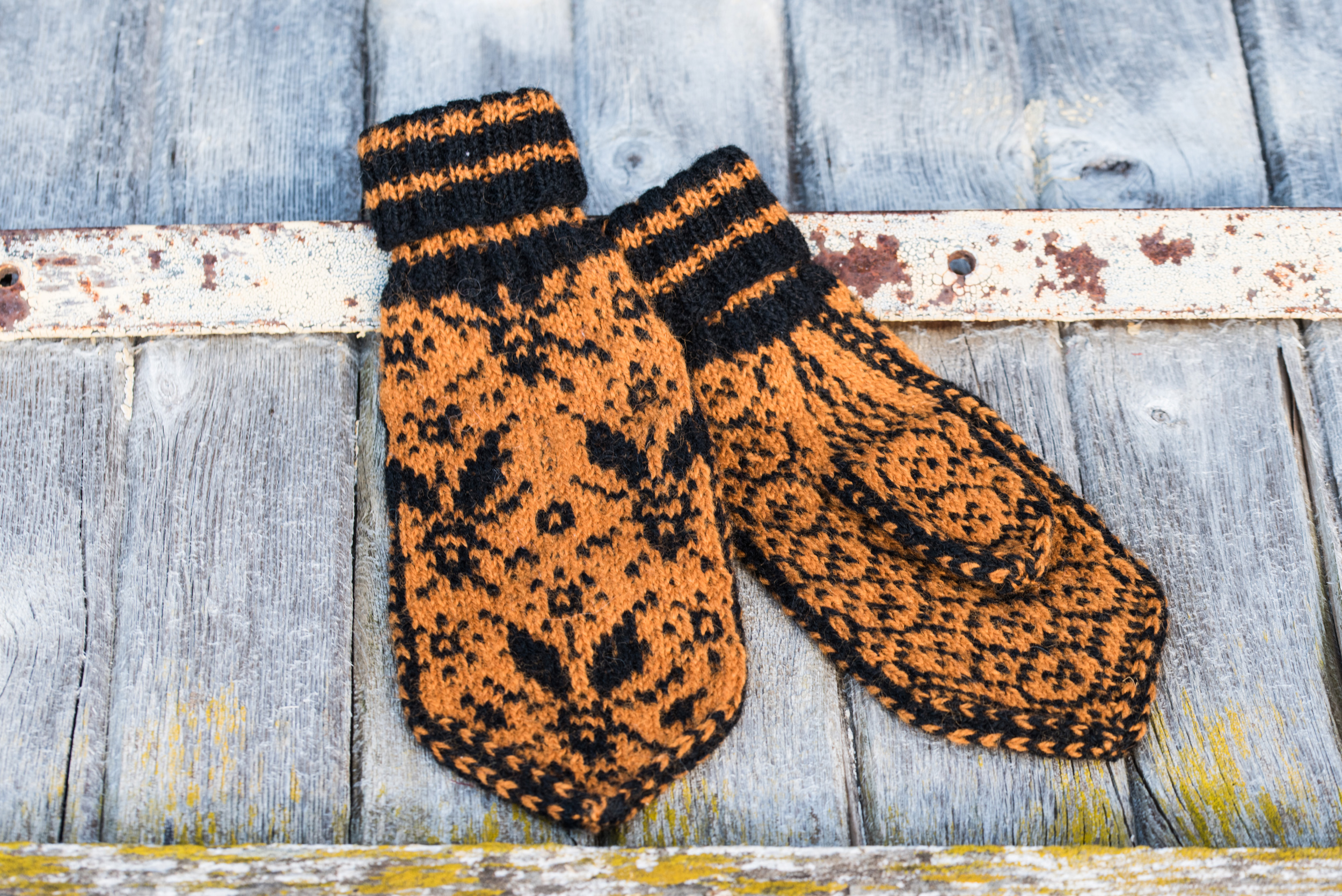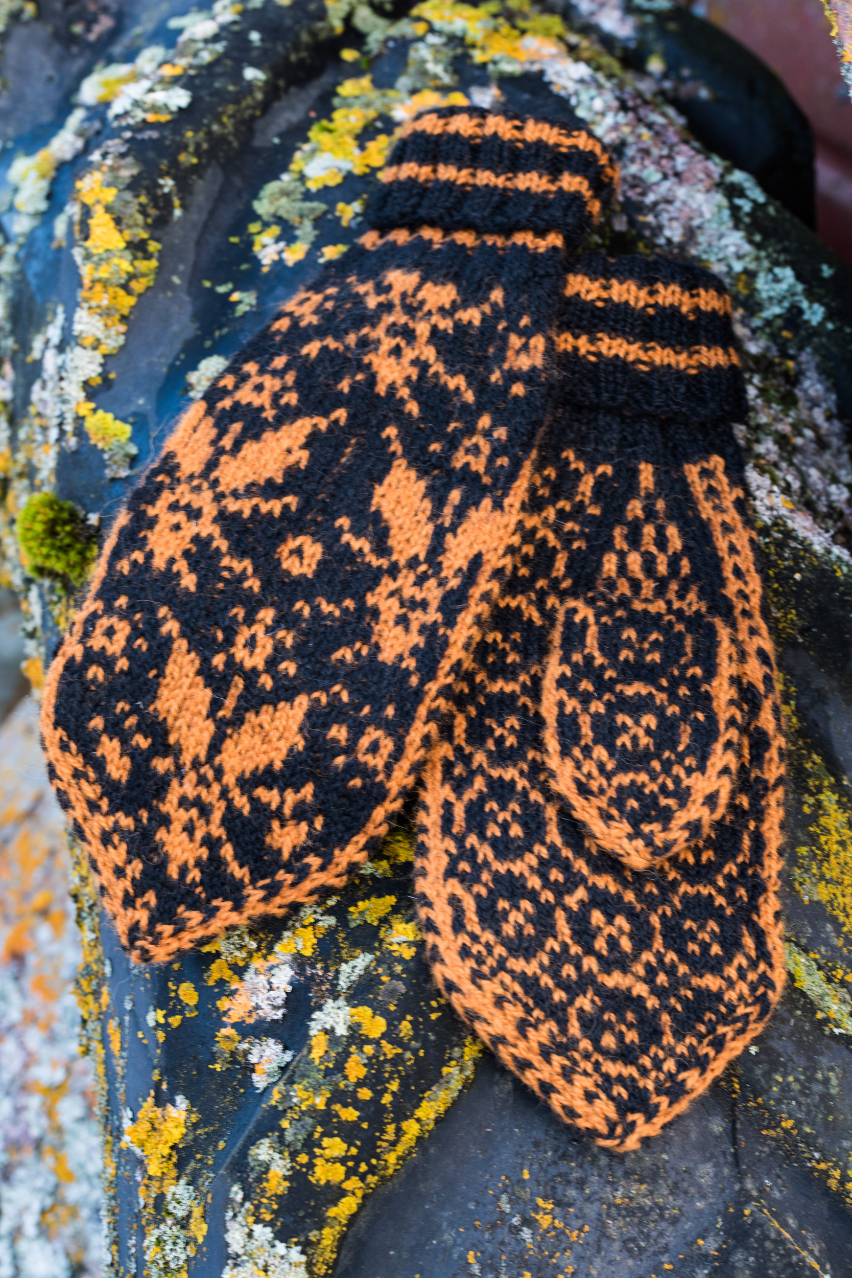 Votter med biemønster. Strikkes i Ask ullgarn.