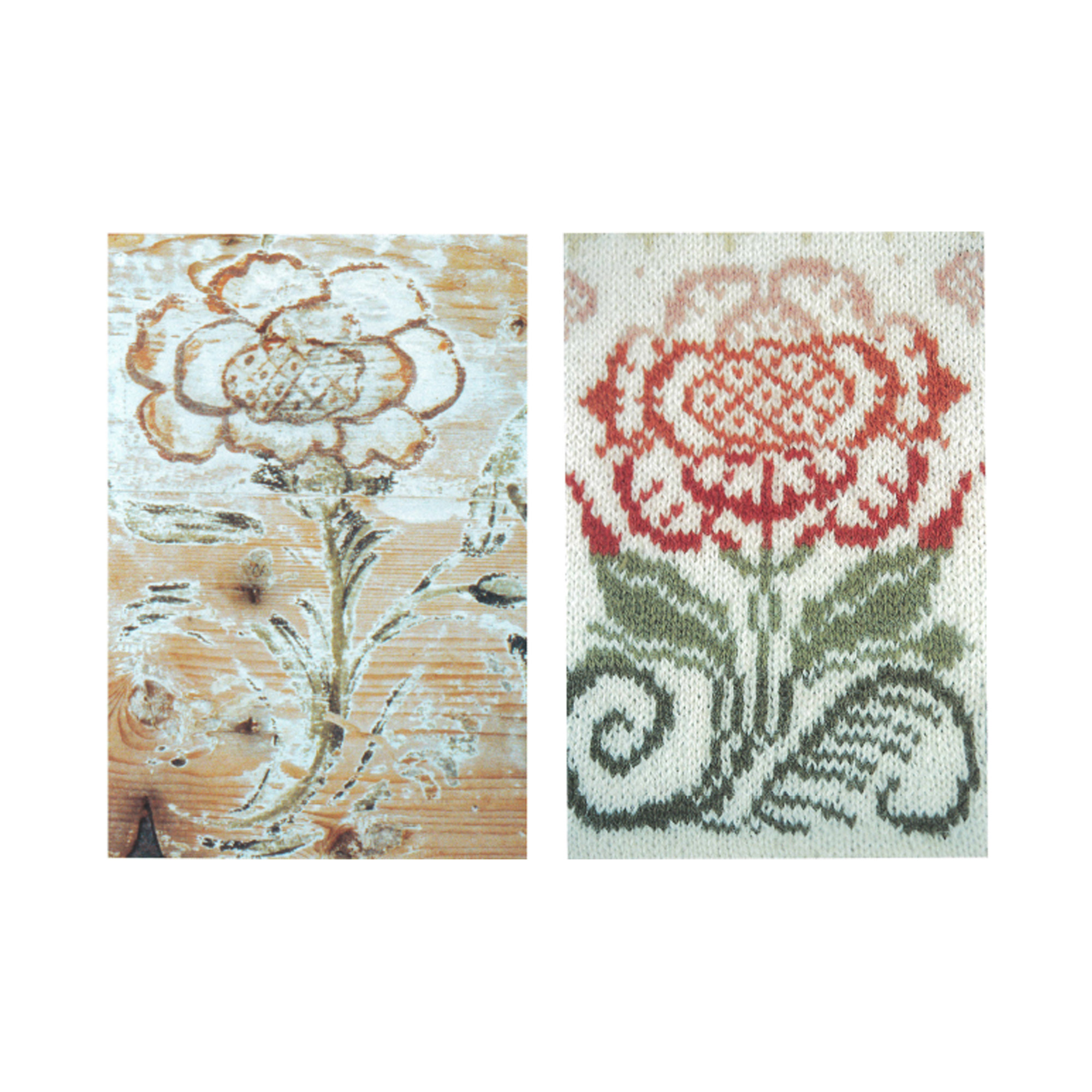 Inspirert av blomster malt på innsiden av et kistelokk funnet på Vestvågøy Museum. Jakken har tradisjonelle blomstermønster i jordfarger på offwhite bunn.