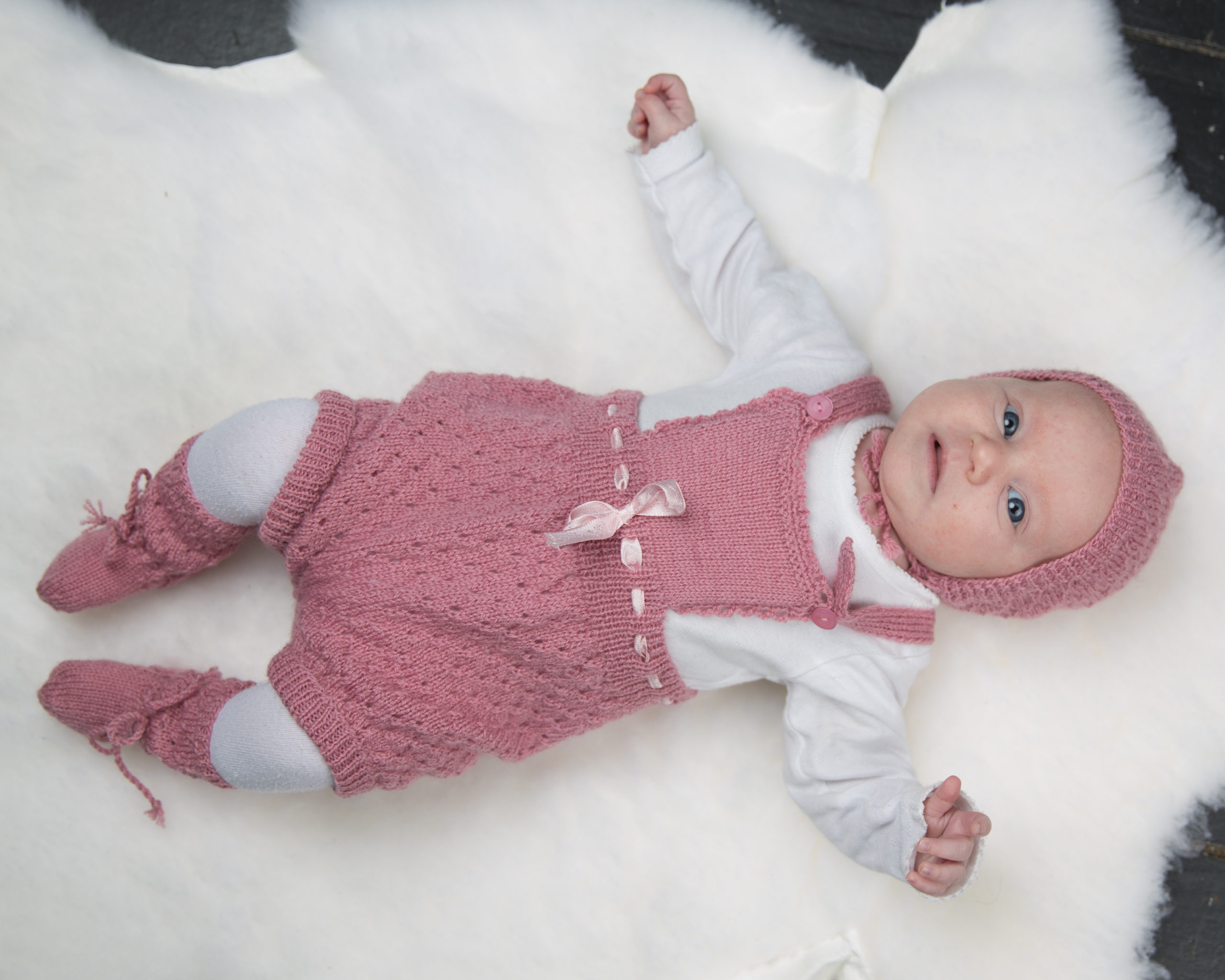 Elina romper, lue og sokker strikkes i Huldra Kamgarn. Garnpakken inneholder garn nok til den aktuelle størrelsen.