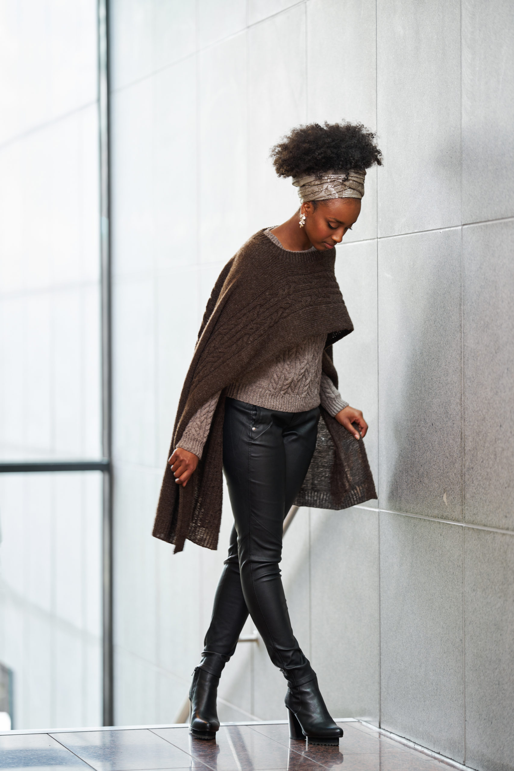 Strikket cape med fletter. Kan brukes på flere ulike måter.