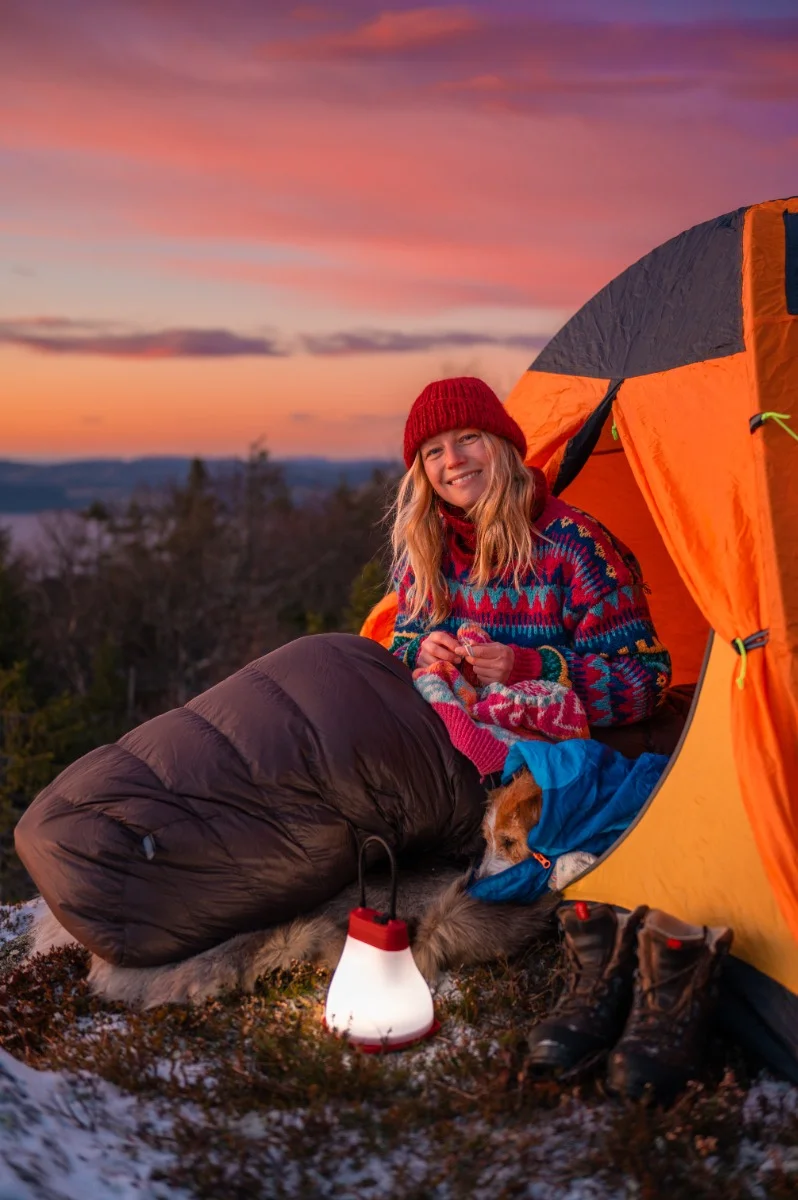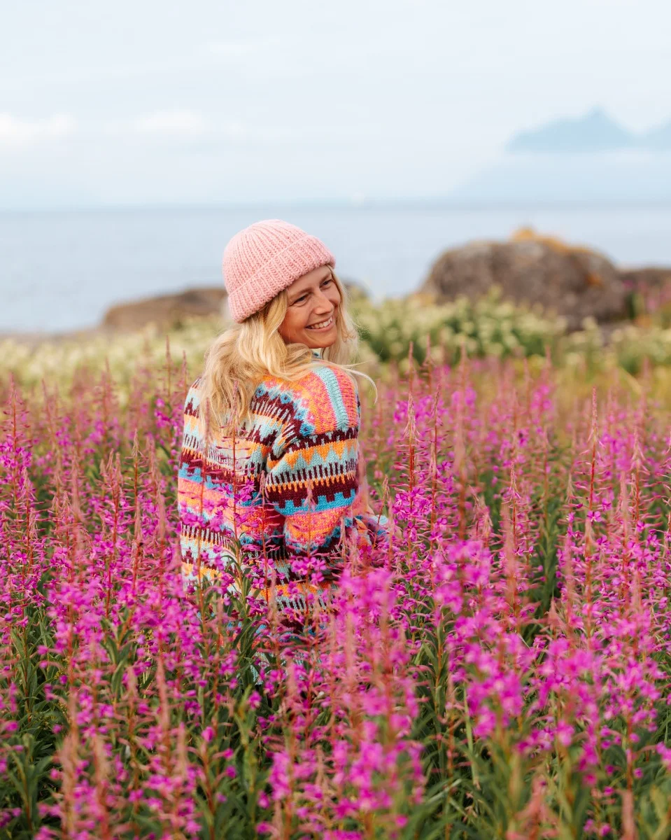 Une Cecilie Oksvold (f.1992) lager fargerik turstrikk i deilig norsk ull som varmer selv på de kaldeste dagene. Hun er foredragsholder og innholdsprodusent. På Instagramkontoen @unececilie inspirerer hun oss til å ta små og store eventyr ute, og deler åpent om psykisk helse og naturens påvirkning.