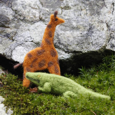 Hobbypakke som inneholder det du trenger for å filte figurer i former: oppskrift, ass farger i kardet ull, 2 former, 2 filtenåler og filteunderlag.