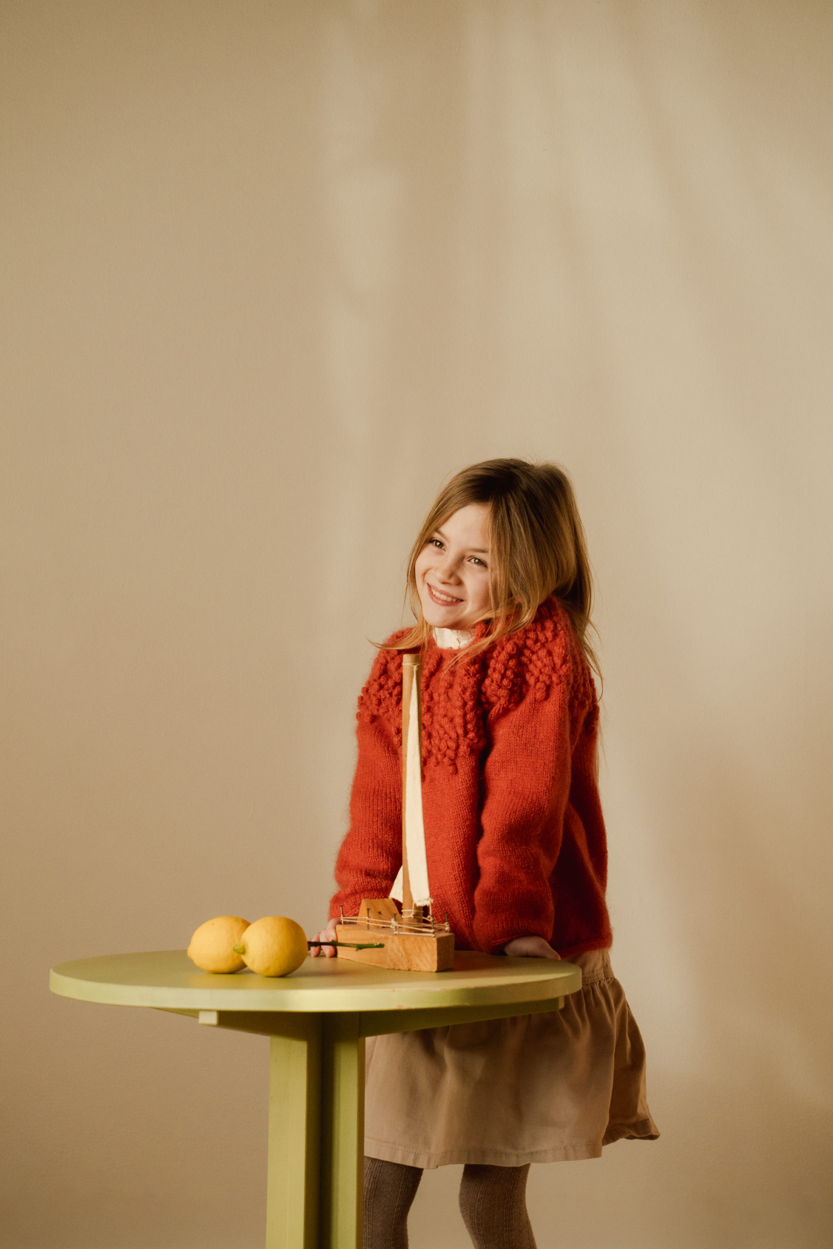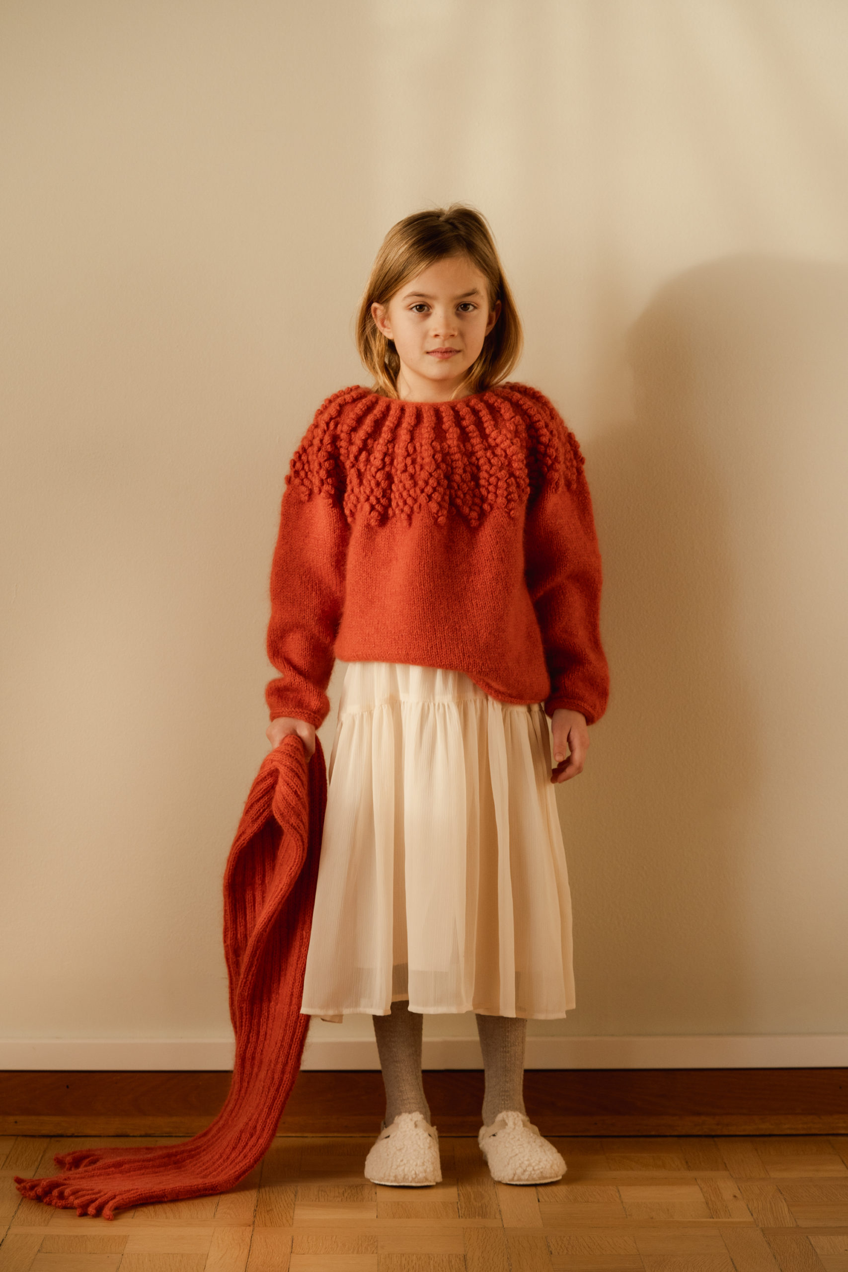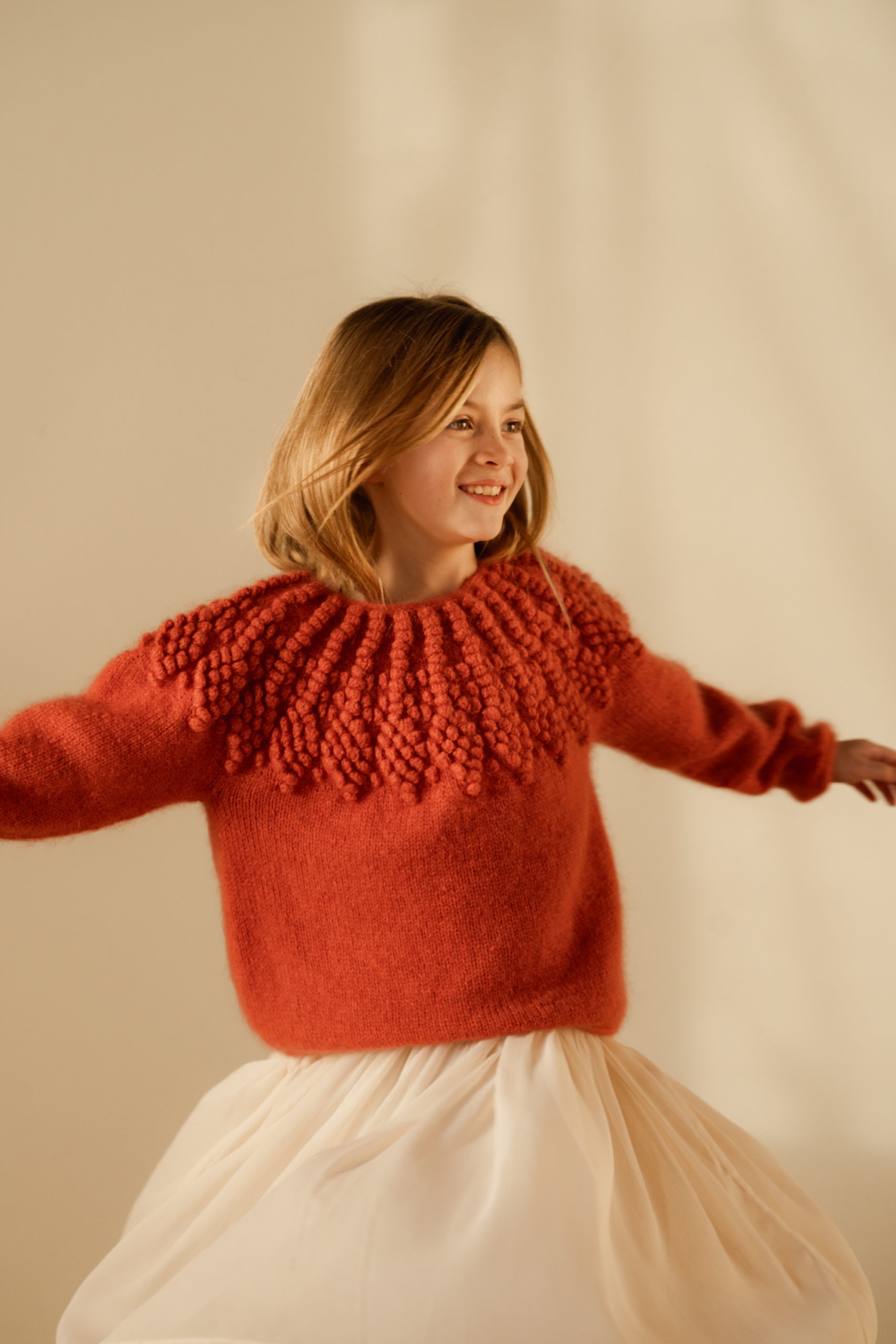 Unisex genser til barn. Denne genseren strikkes rundt ovenfra og ned med avsluttende I-cord kanter. Genserens runde bærestykke er mønstret med bobler og strikkes ut fra et diagram.