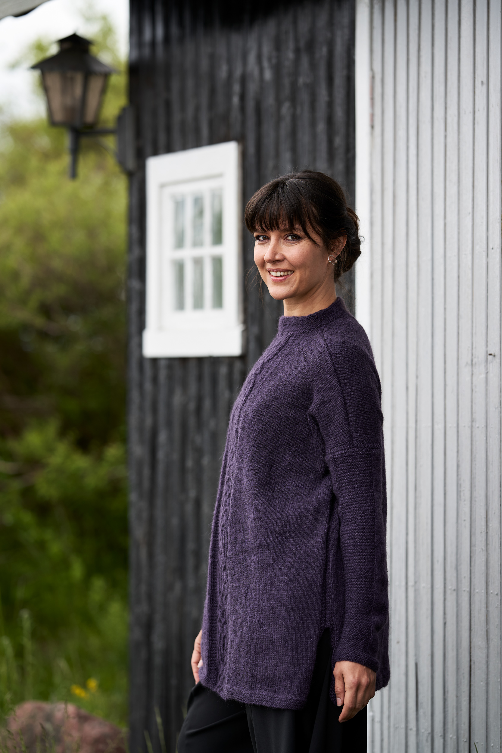 Swoncho (genser/poncho) i Tinde pelsullgarn med splitt i hver side. Strikkes fem og tilbake i deler og sys sammen.