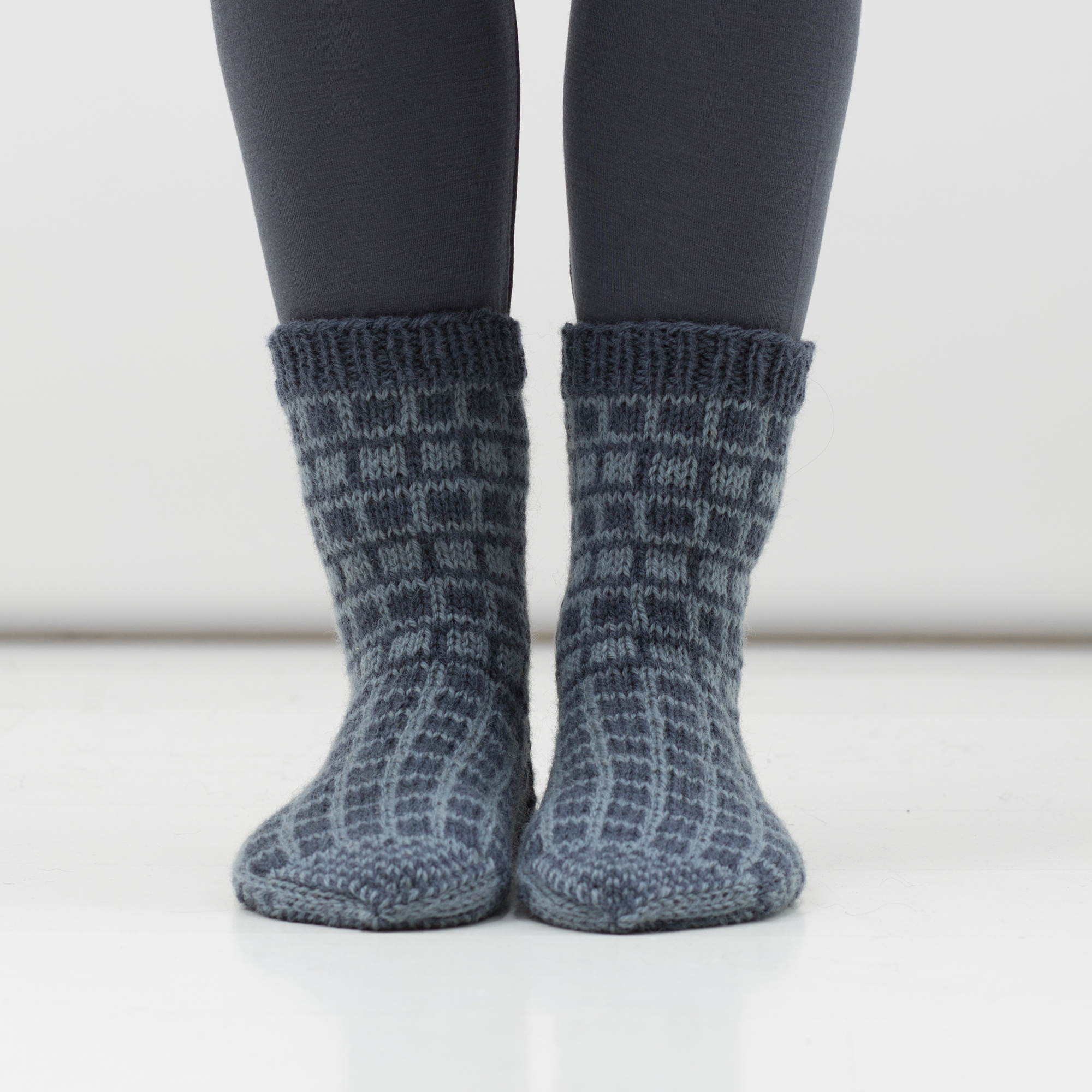 Velg mellom brun og blågrå. Pinneforslag: Strømpepinner nr. 4