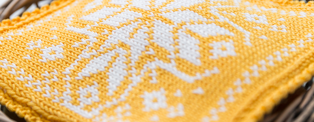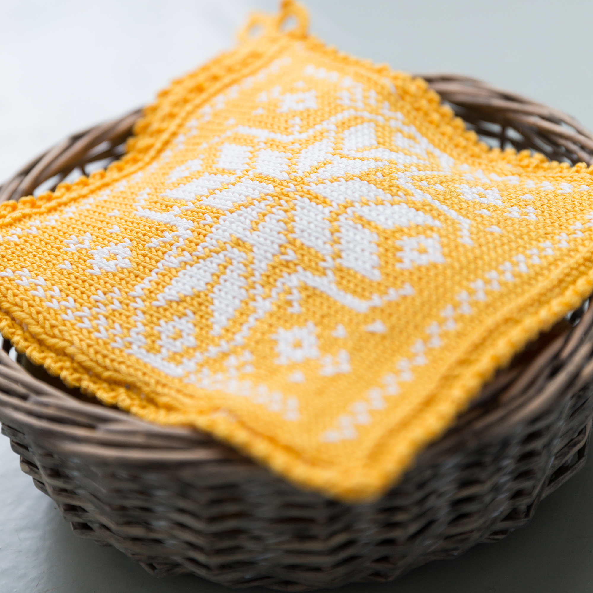 Disse strålende grytelappene har en flott åttebladsrose og en dekorativ heklekant.