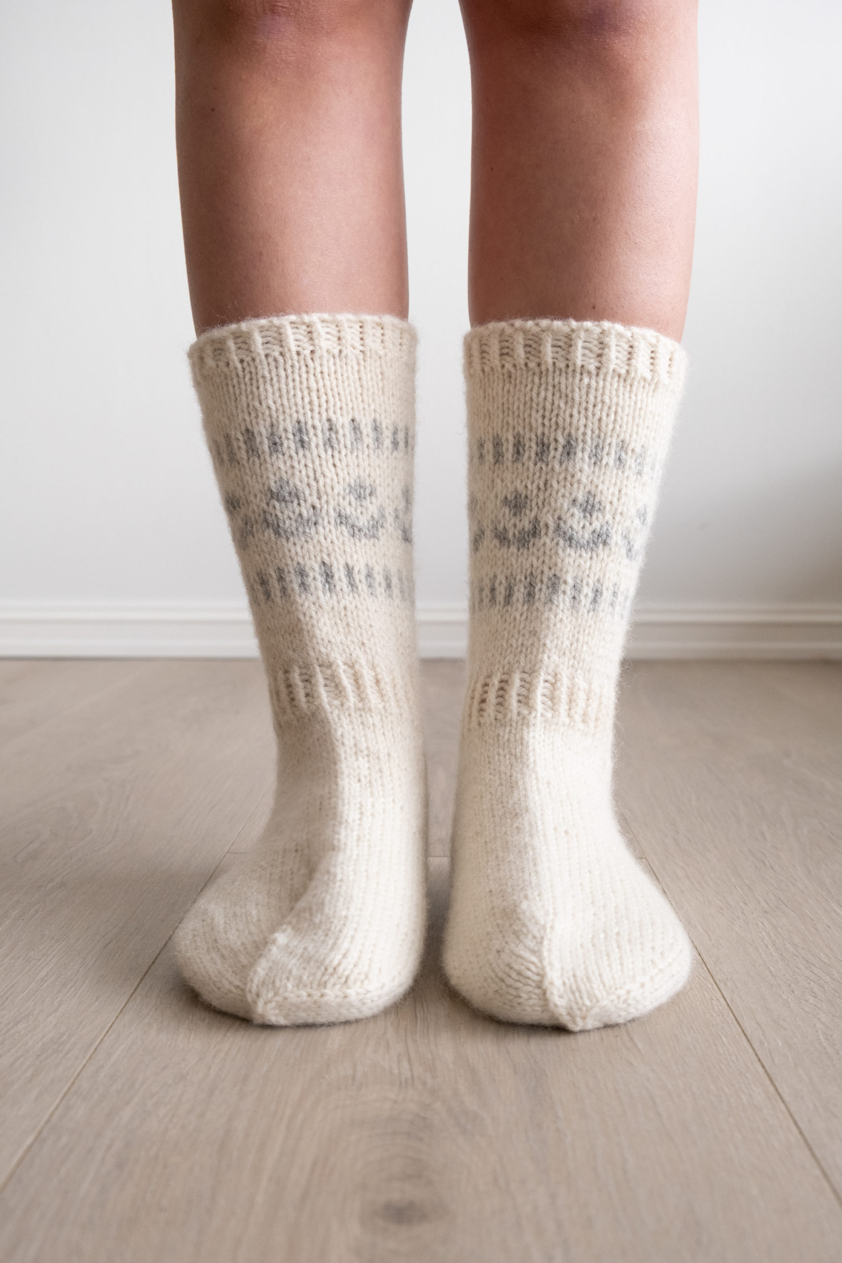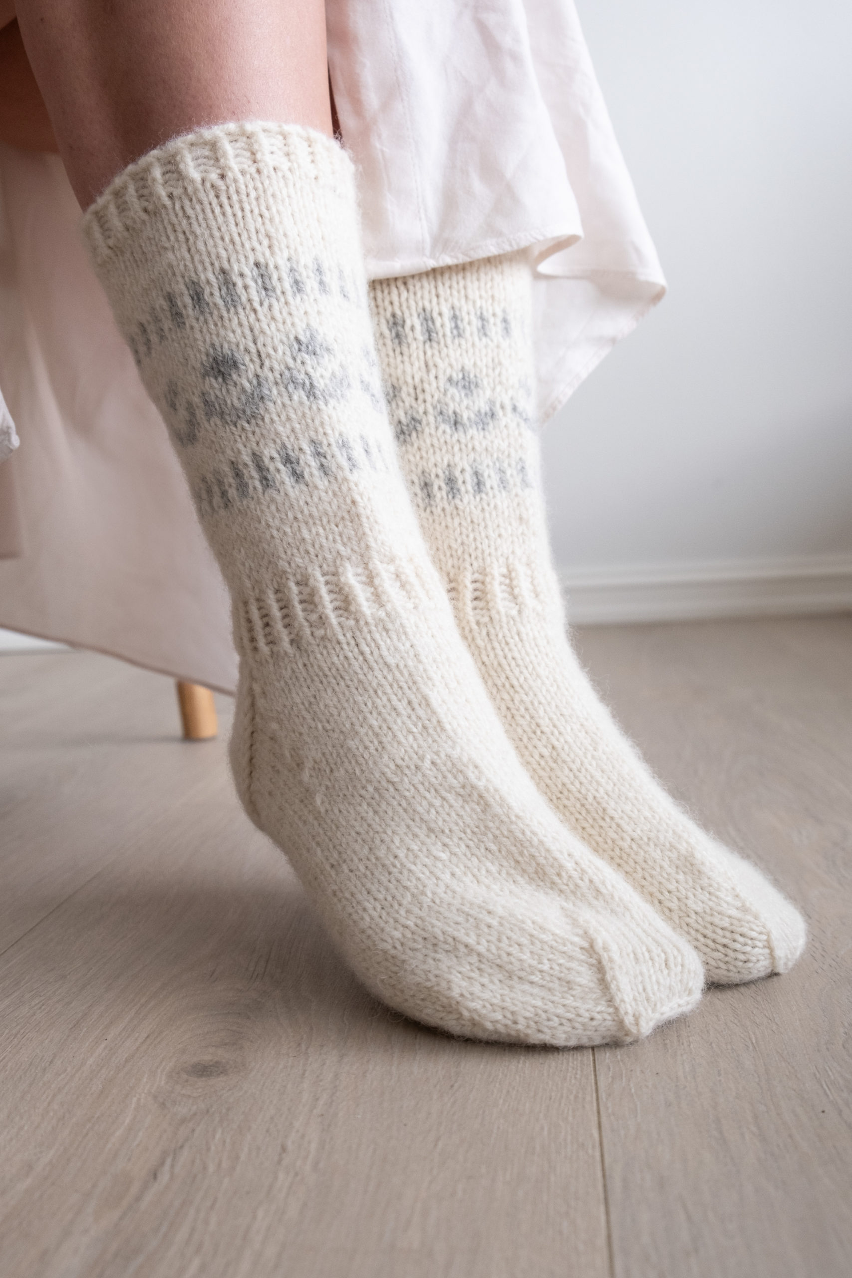 Haugesokken er vist i fargene 100 ubleket hvit og 110 lys grå.