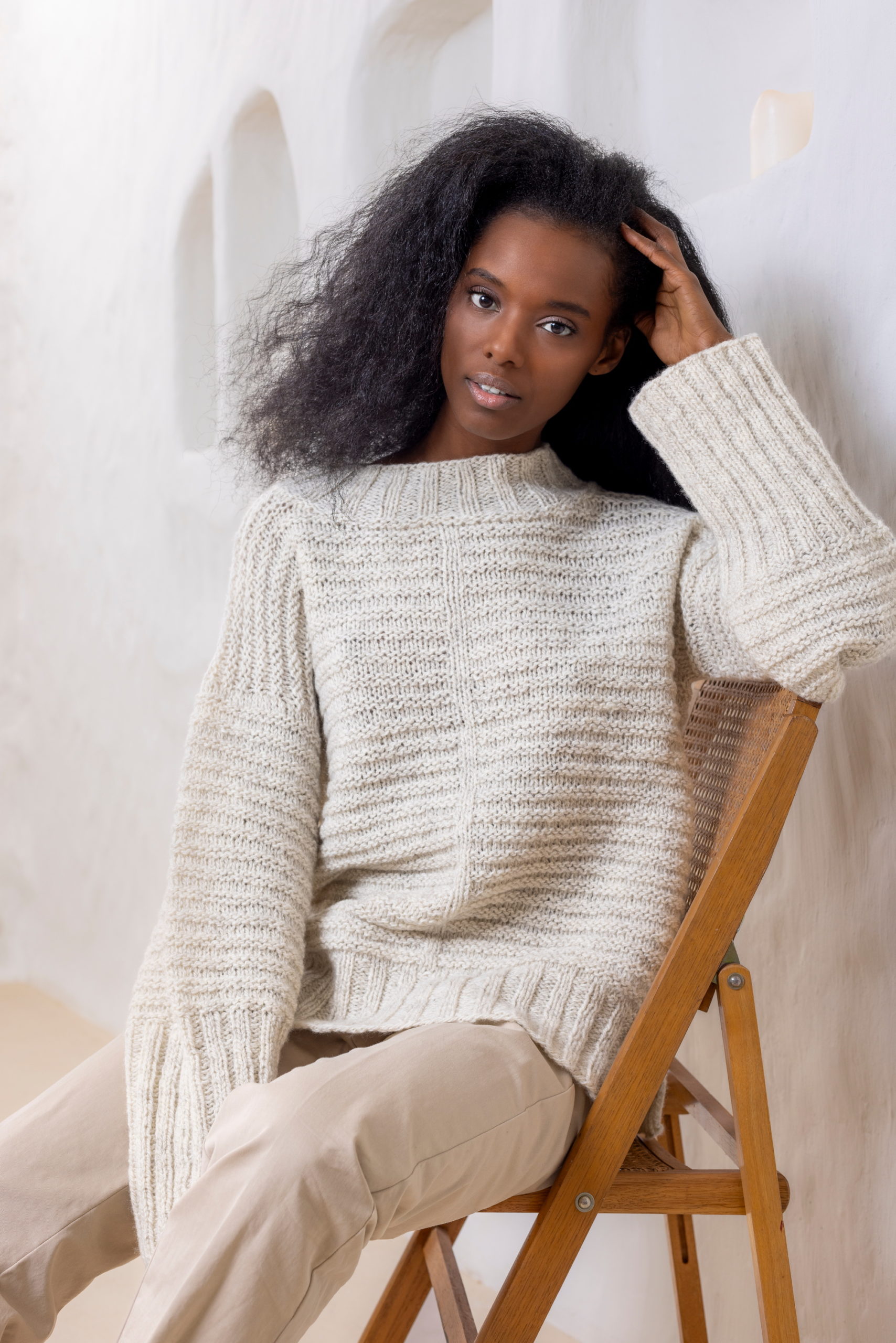 Holly genser er en løst strikket, lett oversized genser som strikkes i myke Luna Lamullgarn.