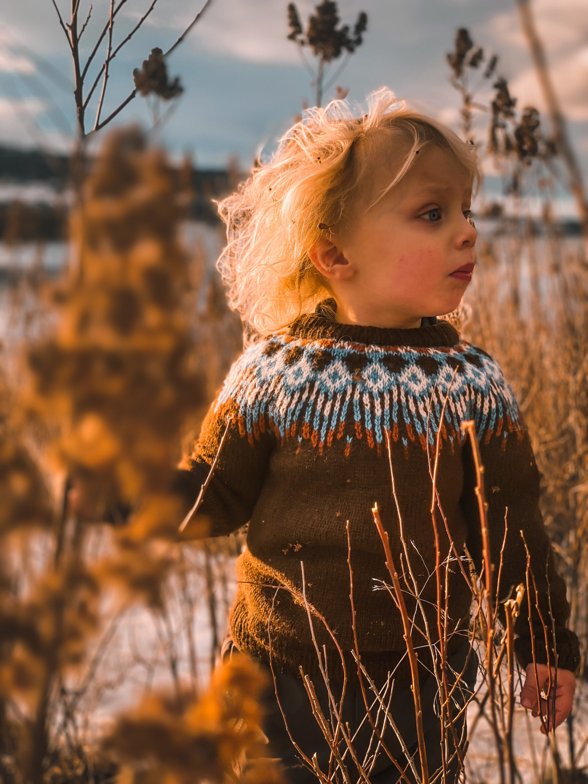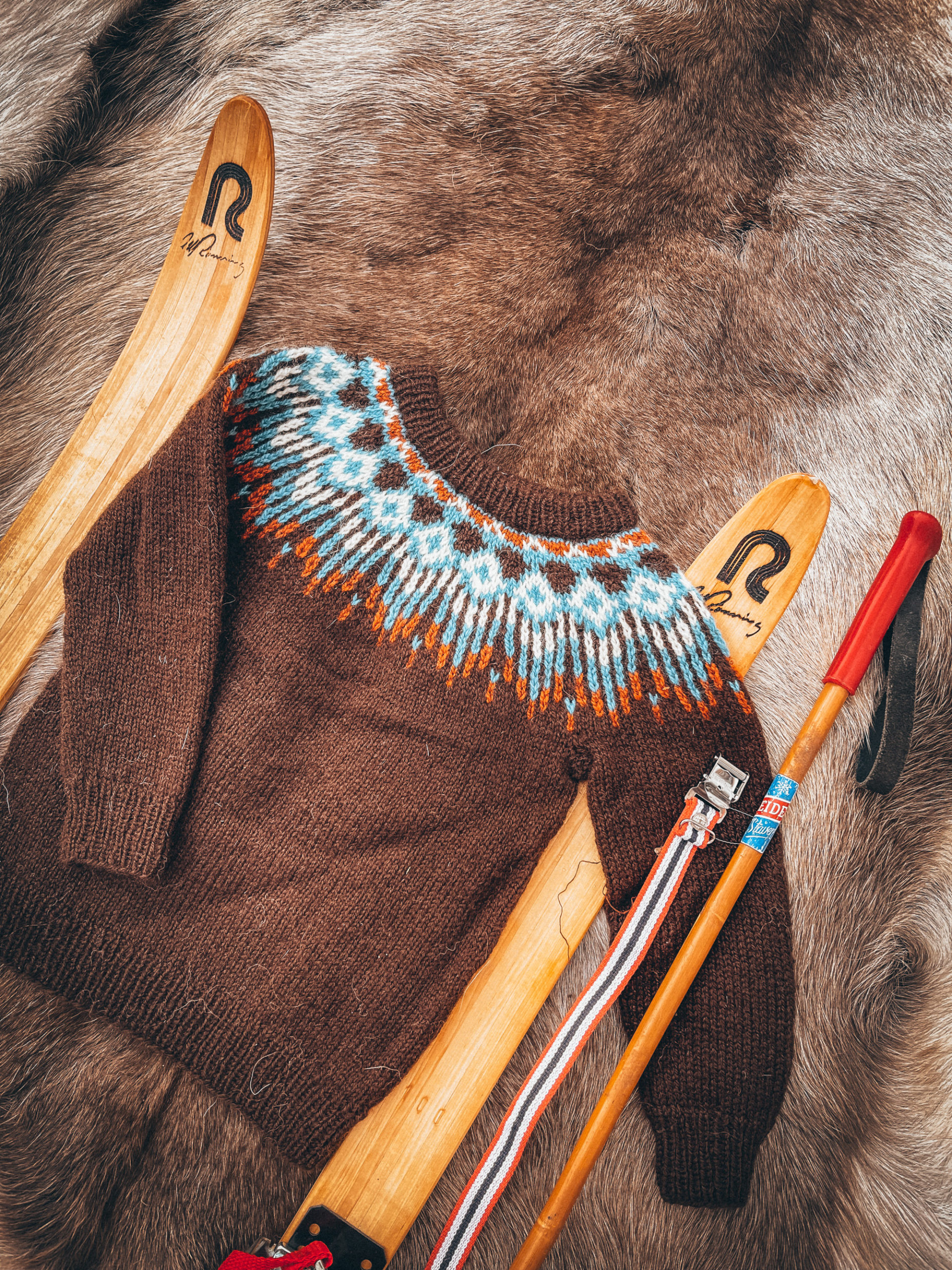 Hopi genser strikkes i Sol Lamullgarn. Garnpakken inneholder garn nok til den aktuelle størrelsen.