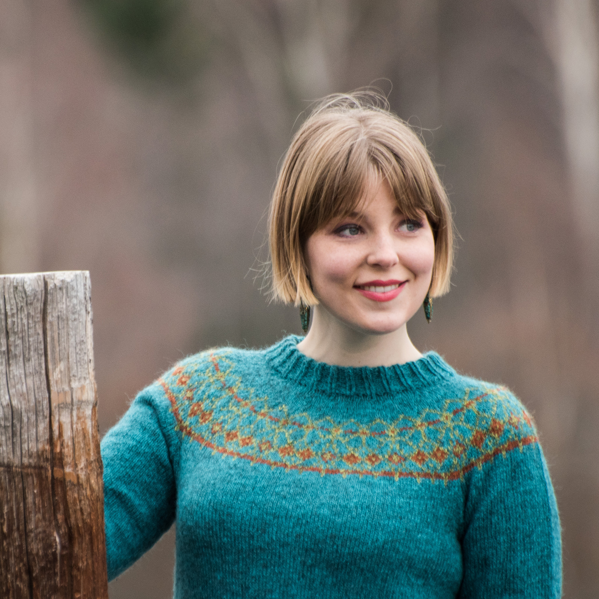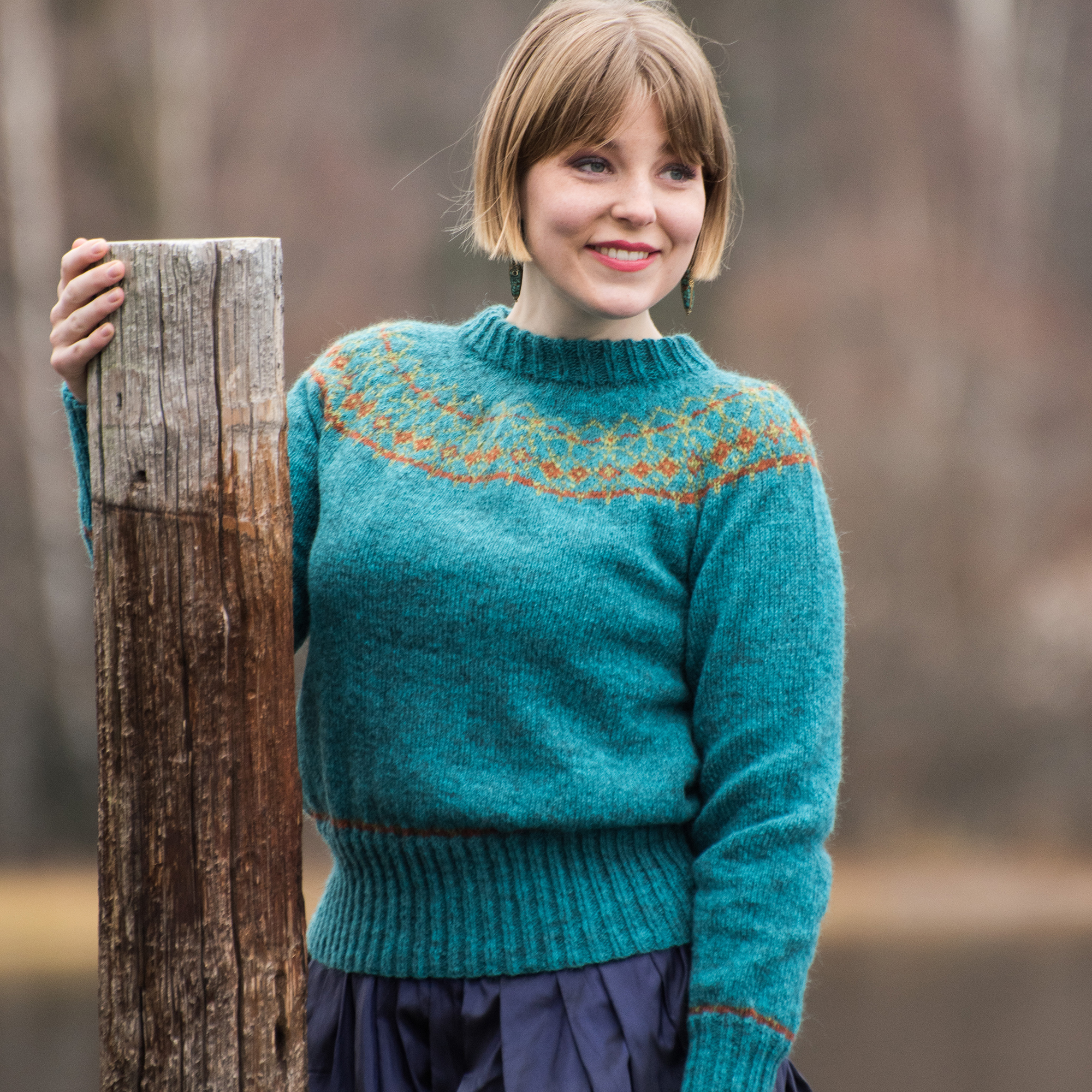 Jane – genser med rundt bærestykke. Genseren strikkes i Sølje pelsullgarn. Garnpakken inneholder oppskrift og garn nok til den aktuelle størrelsen.