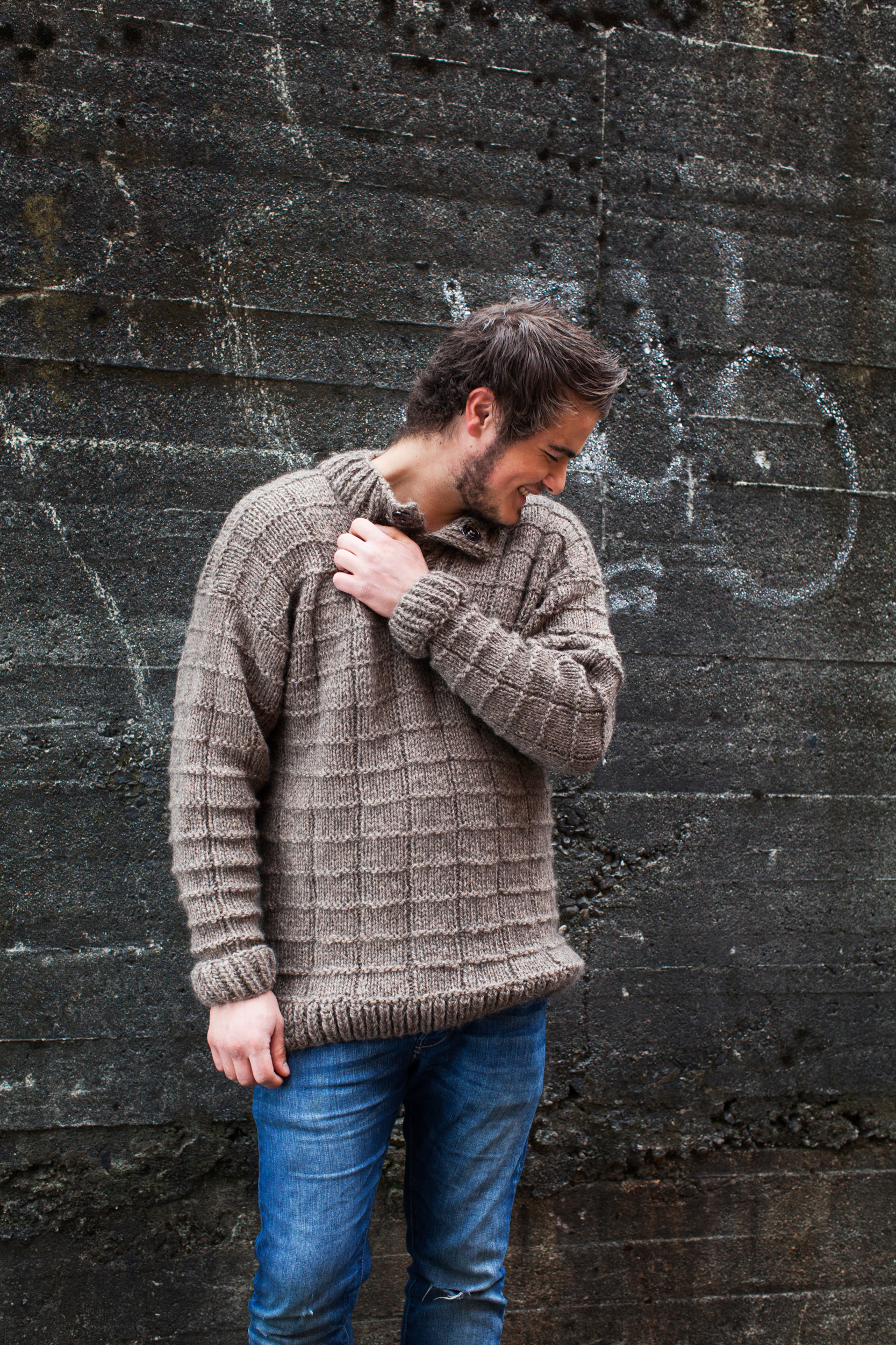 Strikket herregenser med rutemønster. Genseren strikkes nedenfra og opp i Blåne pelsullgarn.