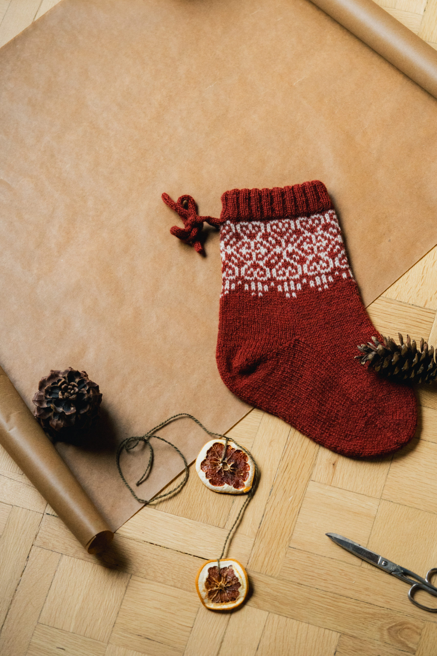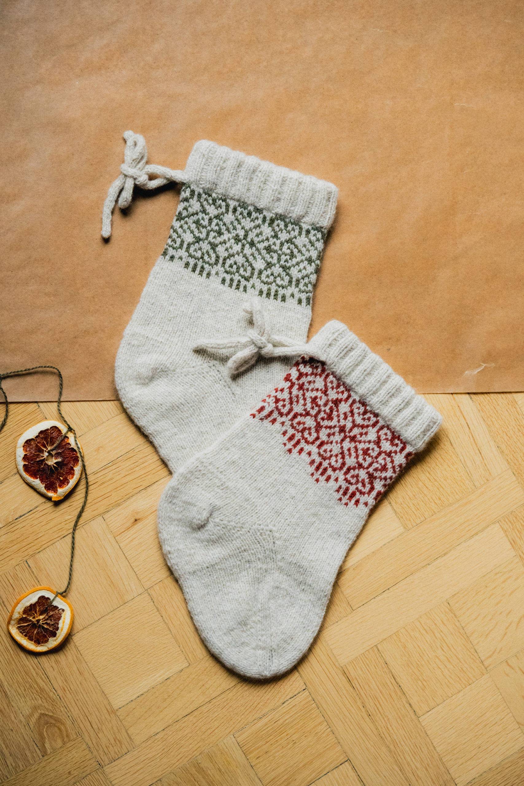 Strikket julesokk med tofarget mønster. Julesokken strikkes ovenfra og ned i glattstrikk, med mønster etter diagram og i-cordsnorer til oppheng.