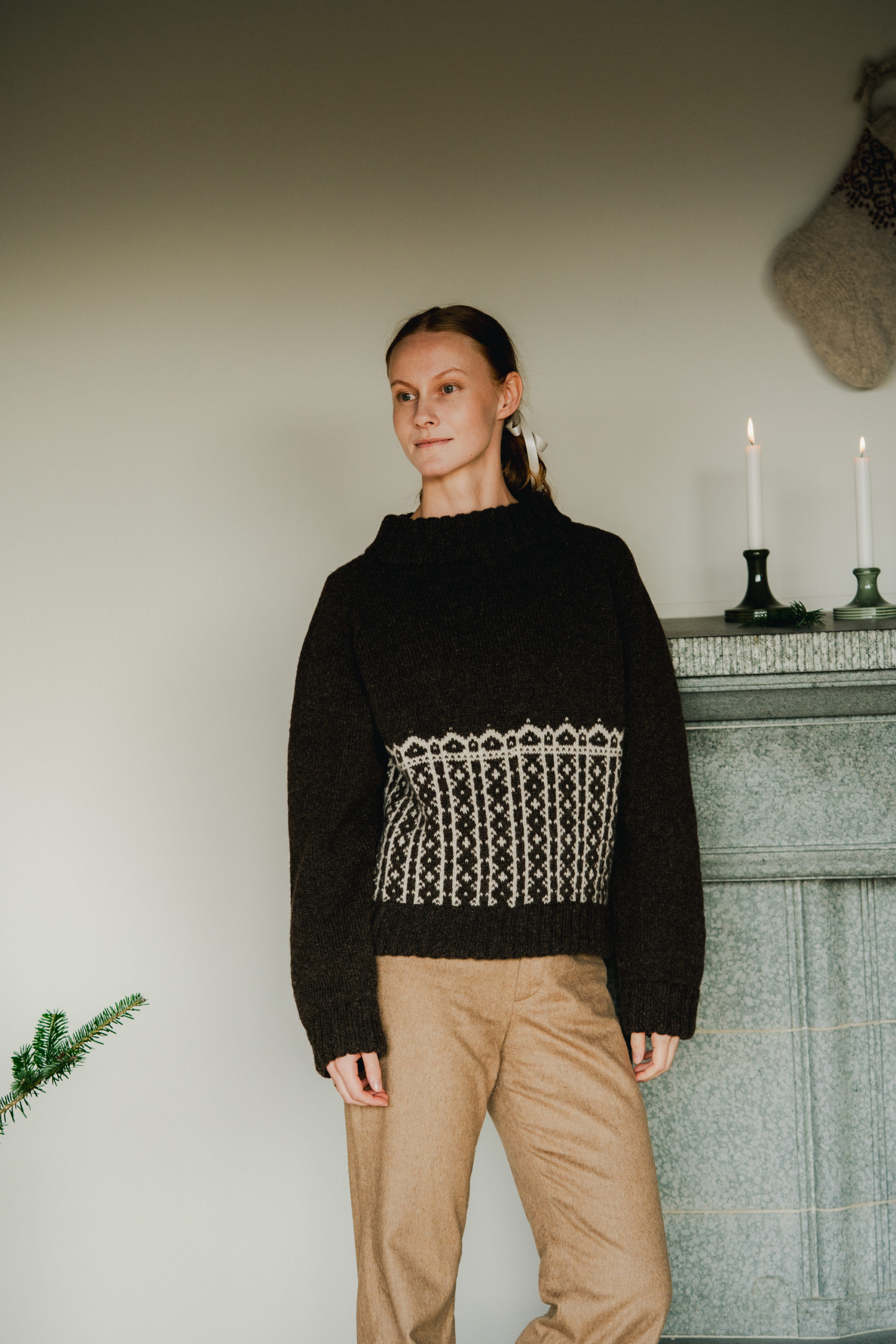 – Farge A (bunnfarge): Sol lamullgarn i fargen 452 melert mørk brun, (290 m pr 100g).