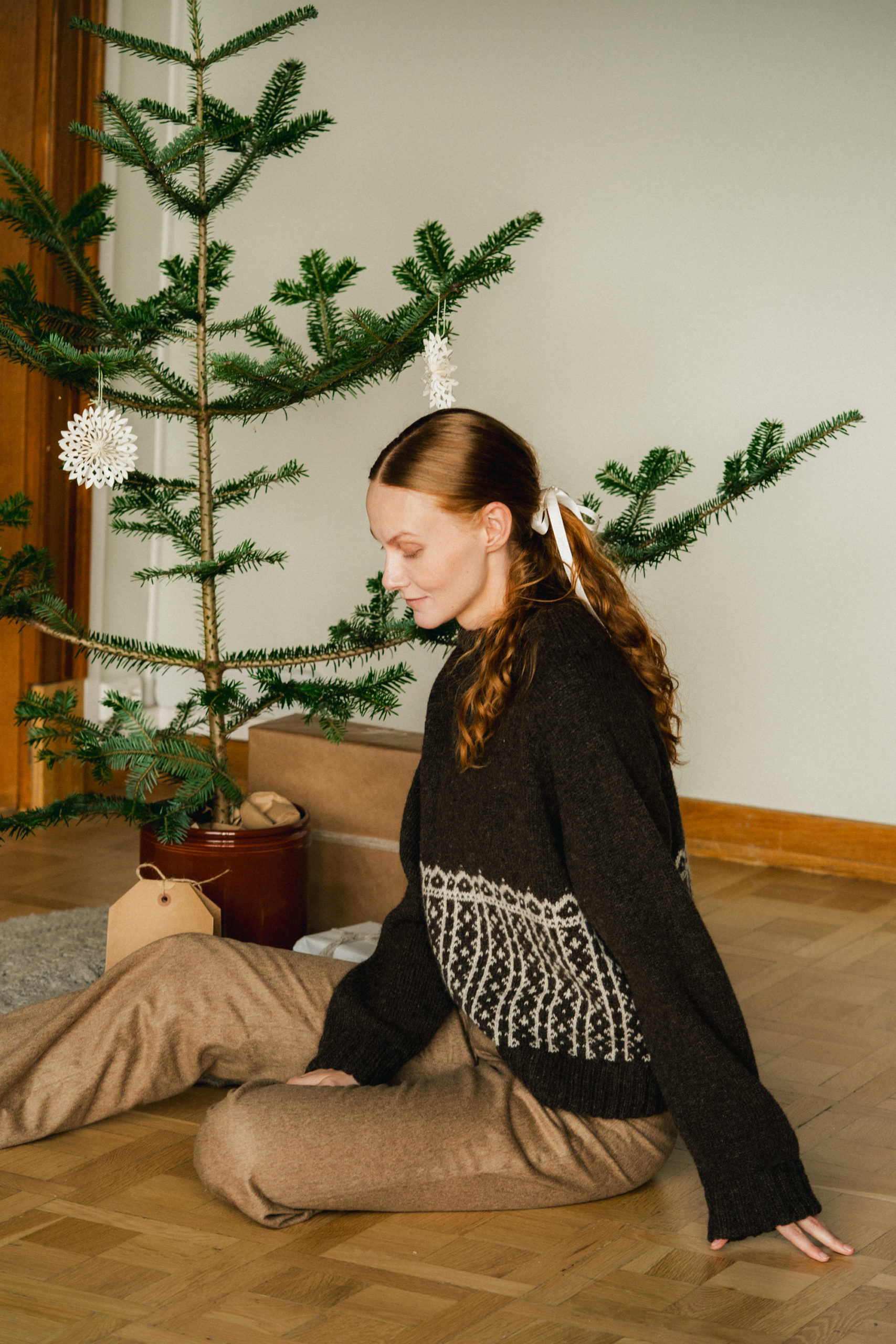 – Farge B (mønsterfarge): Sol lamullgarn i fargen 456 støvet oliven (290 m pr 100g).
