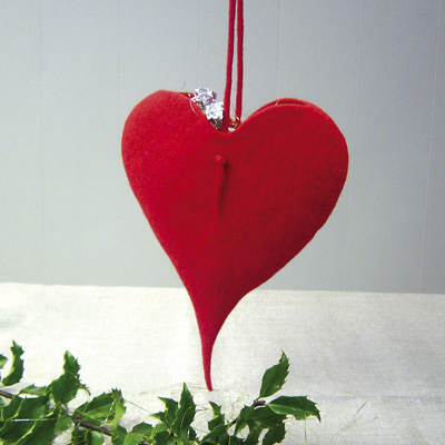 Dekorative hjerter som kan henges opp og fylles med godteri eller hjertet kan brukes som veske med en lukkehempe. Hjertene er tovet rundt en mal. Julehjerter er inndelt i to pakker. Hver av pakkene inneholder oppskrift og alt man trenger av ull (kardet og merino) for å lage hjertene.Designet av: Karin Flatøy Svarstad