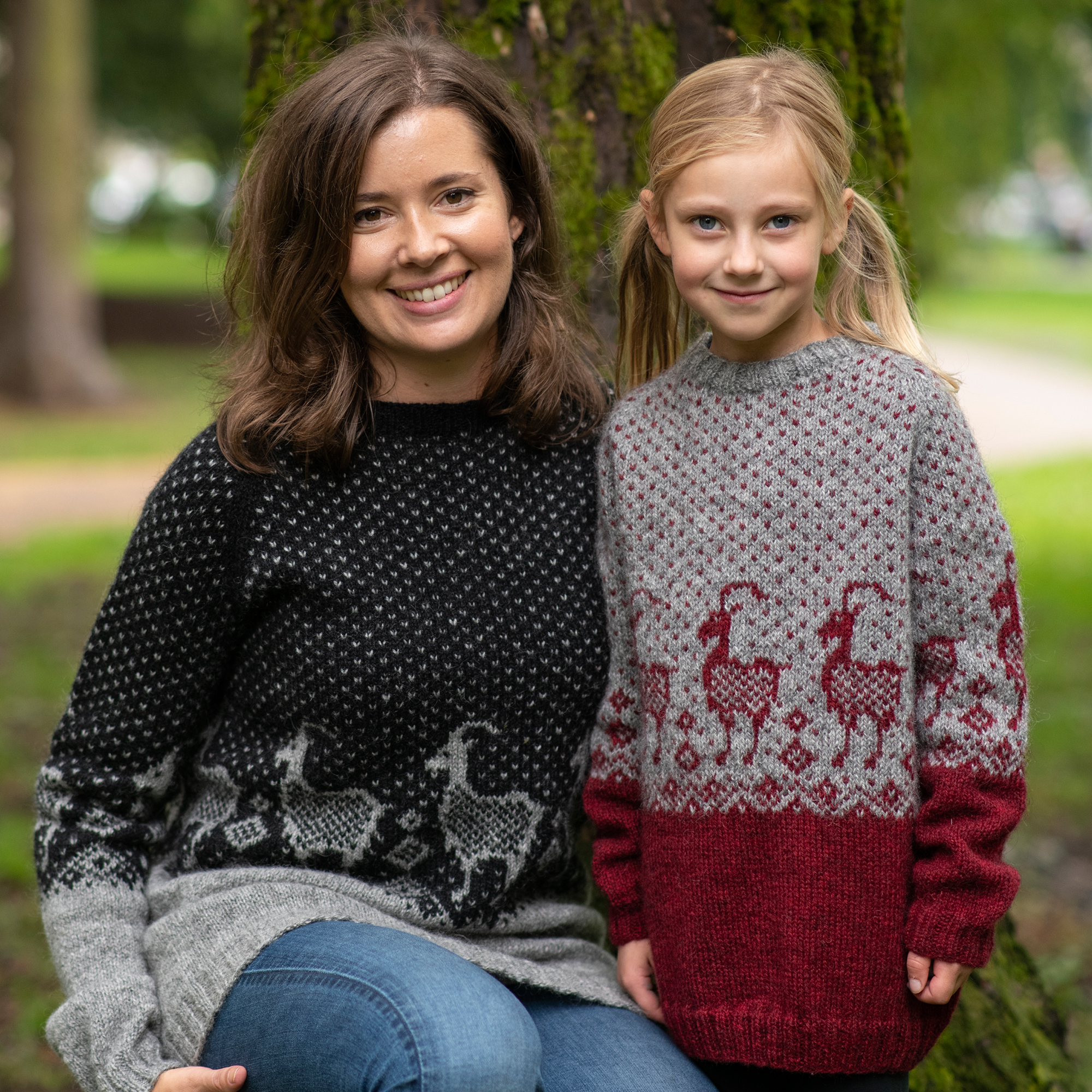 Geitestrikk til barn strikkes i Tinde pelsullgarn. Garnpakken inneholder oppskrift og garn nok til den aktuelle størrelsen. Genseren kan strikkes i 2 varianter, der man kan bytte om på mønsterfarge og bunnfarge. I garnpakken er det nok garn til å kunne velge enten den ene eller andre varianten.