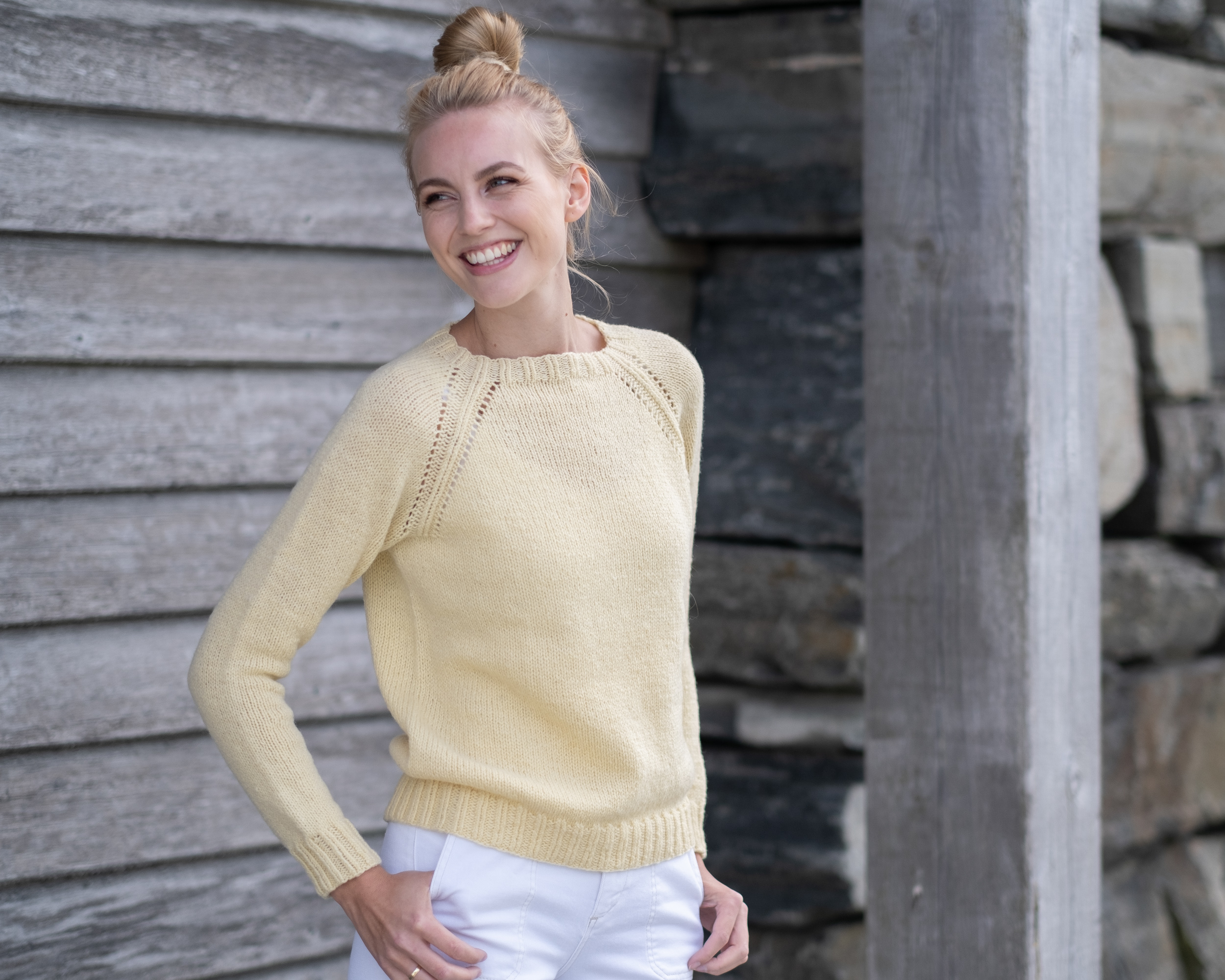 Enkel raglangenser som strikkes ovenfra og ned i Sol lamullgarn.