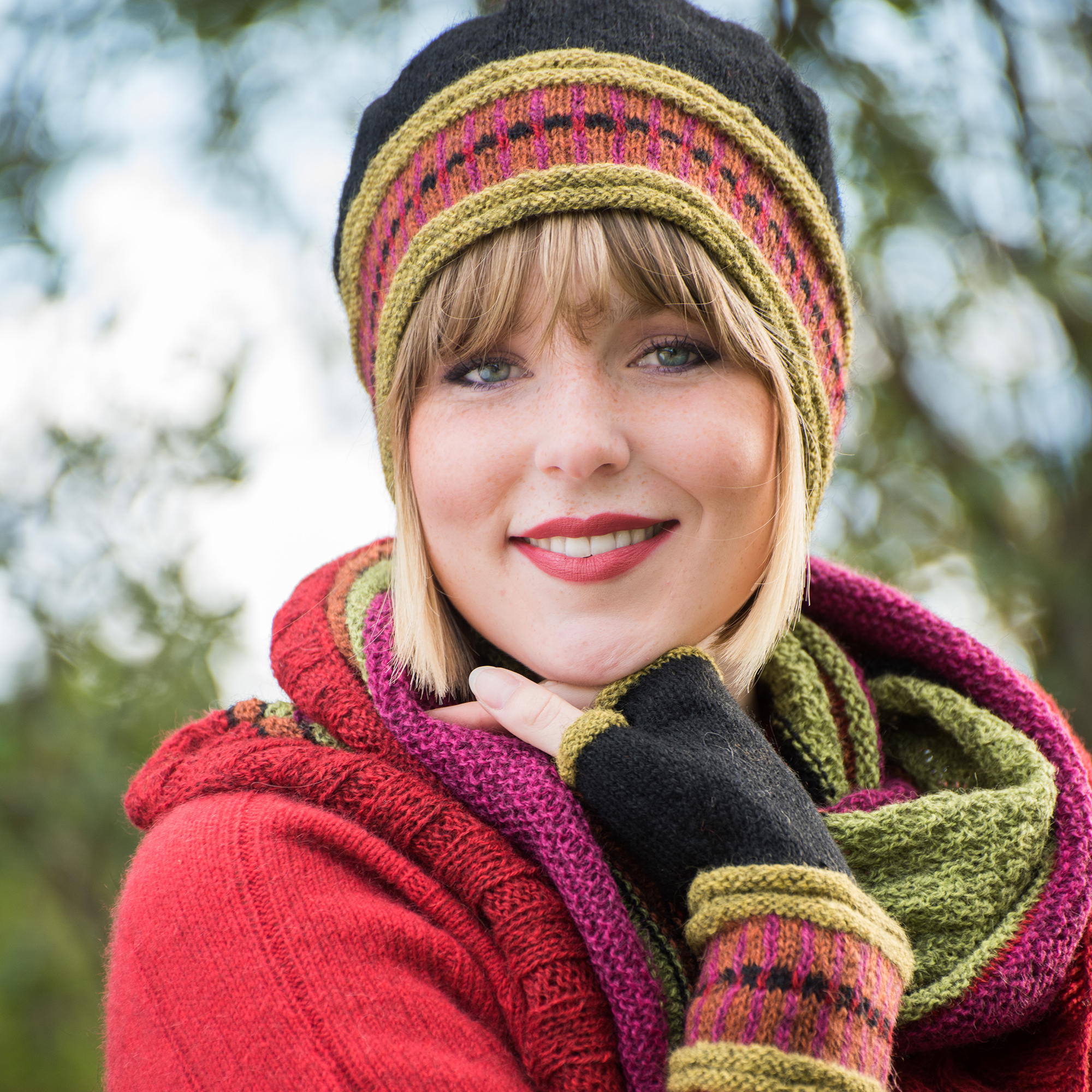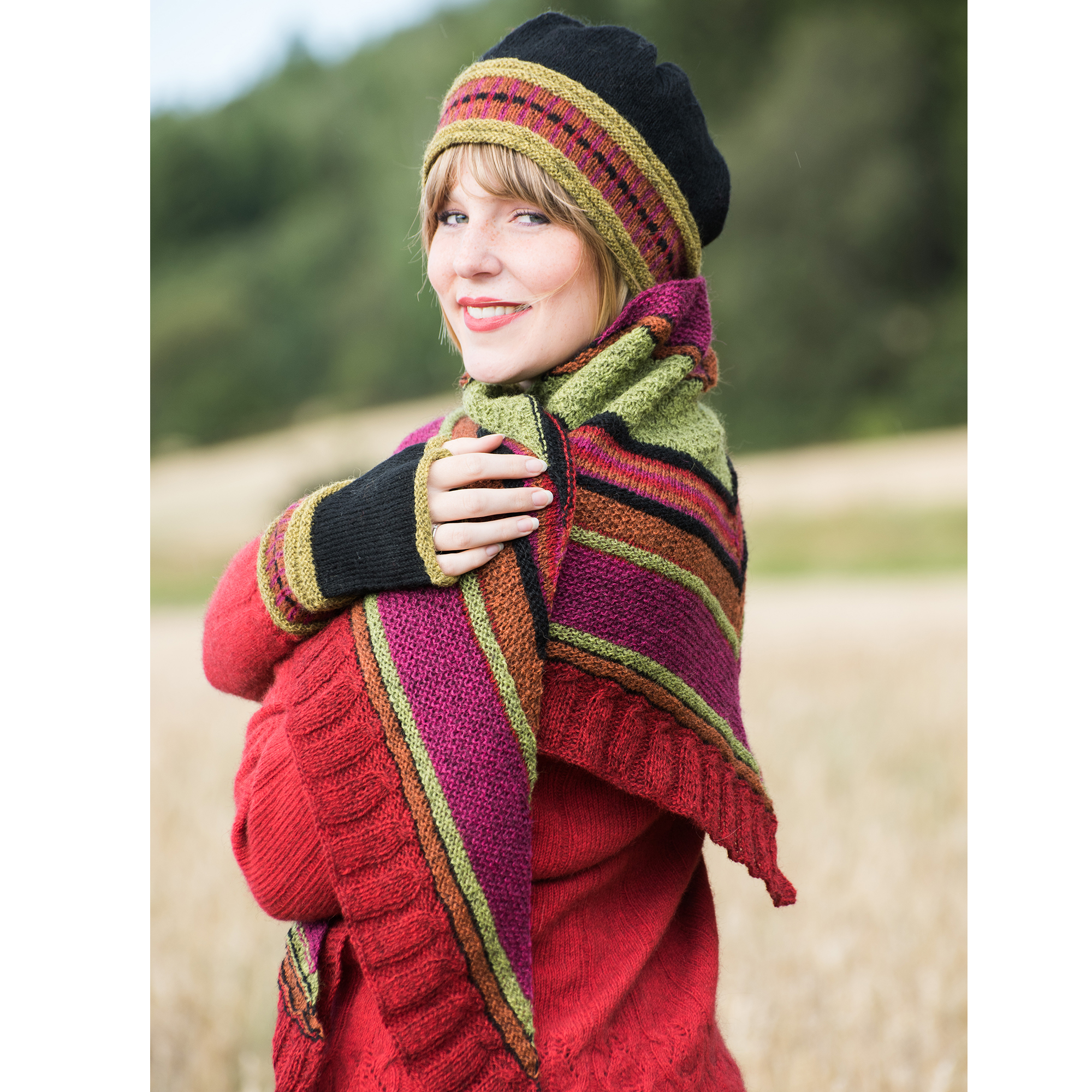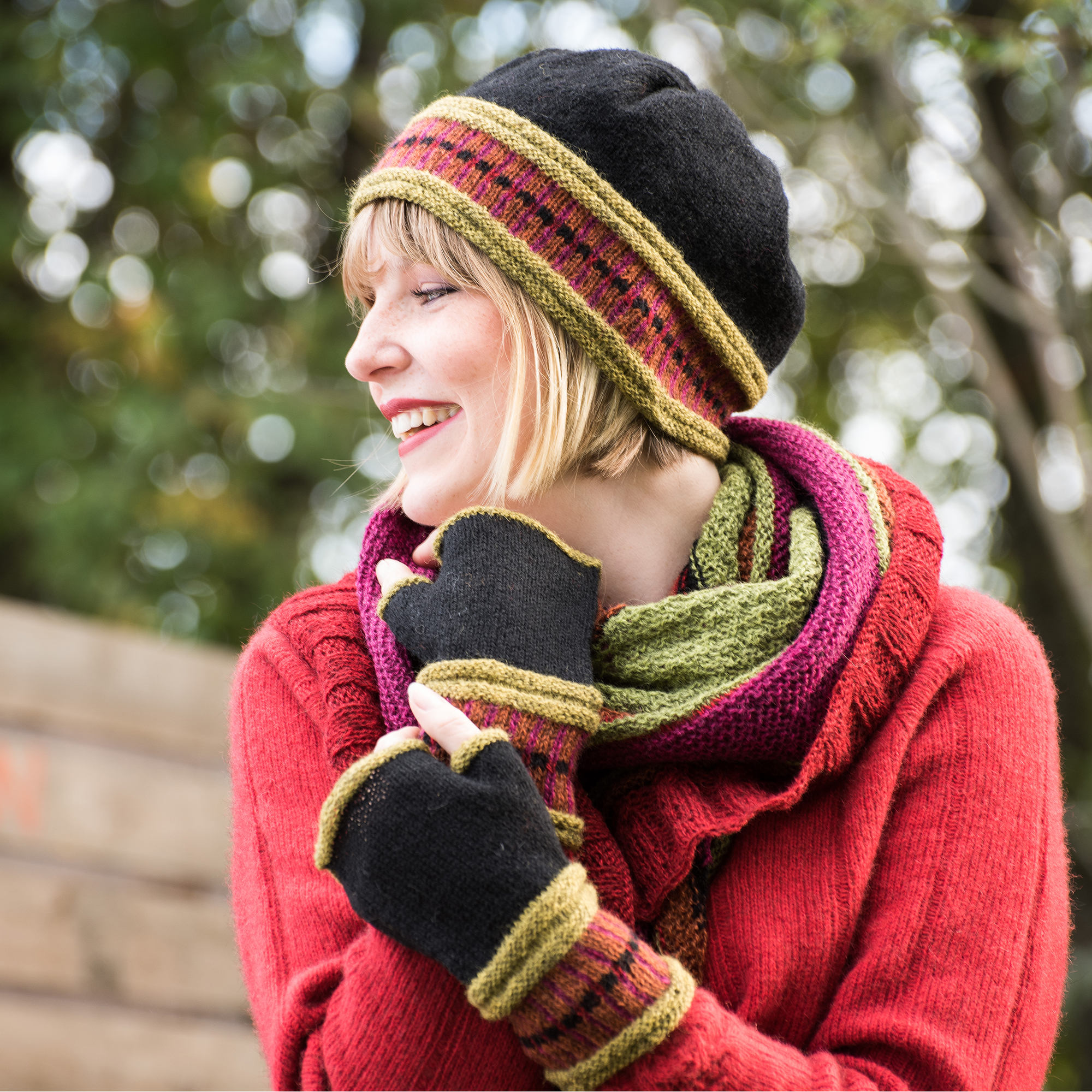 Mathilde lue, sjal og pulsvarmere – garnpakken inneholder oppskrift og garn nok til hele settet.