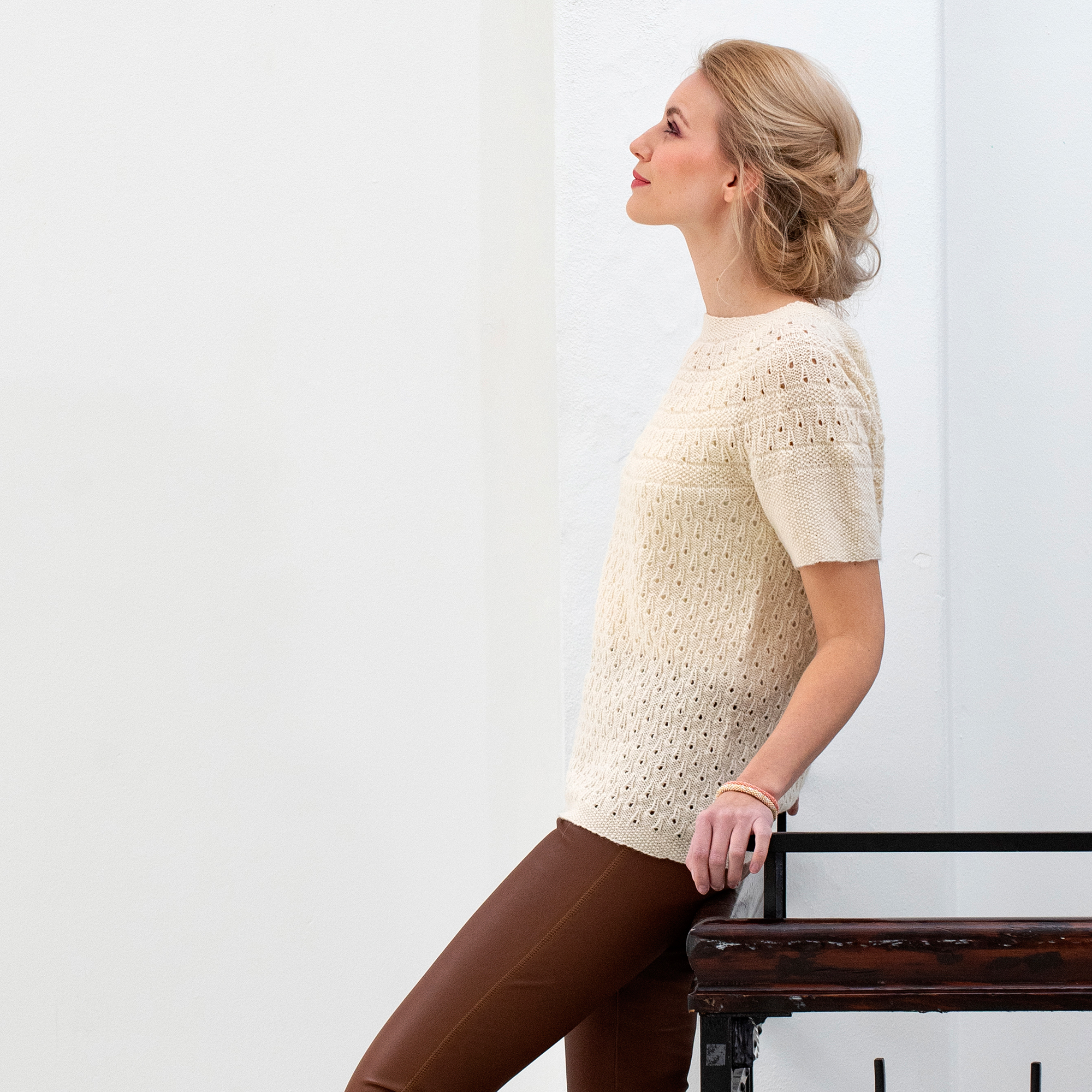 Toppen strikkes nedenfra og opp. Først strikkes bolen og ermene for så å samles til bærestykket, som strikkes til slutt.