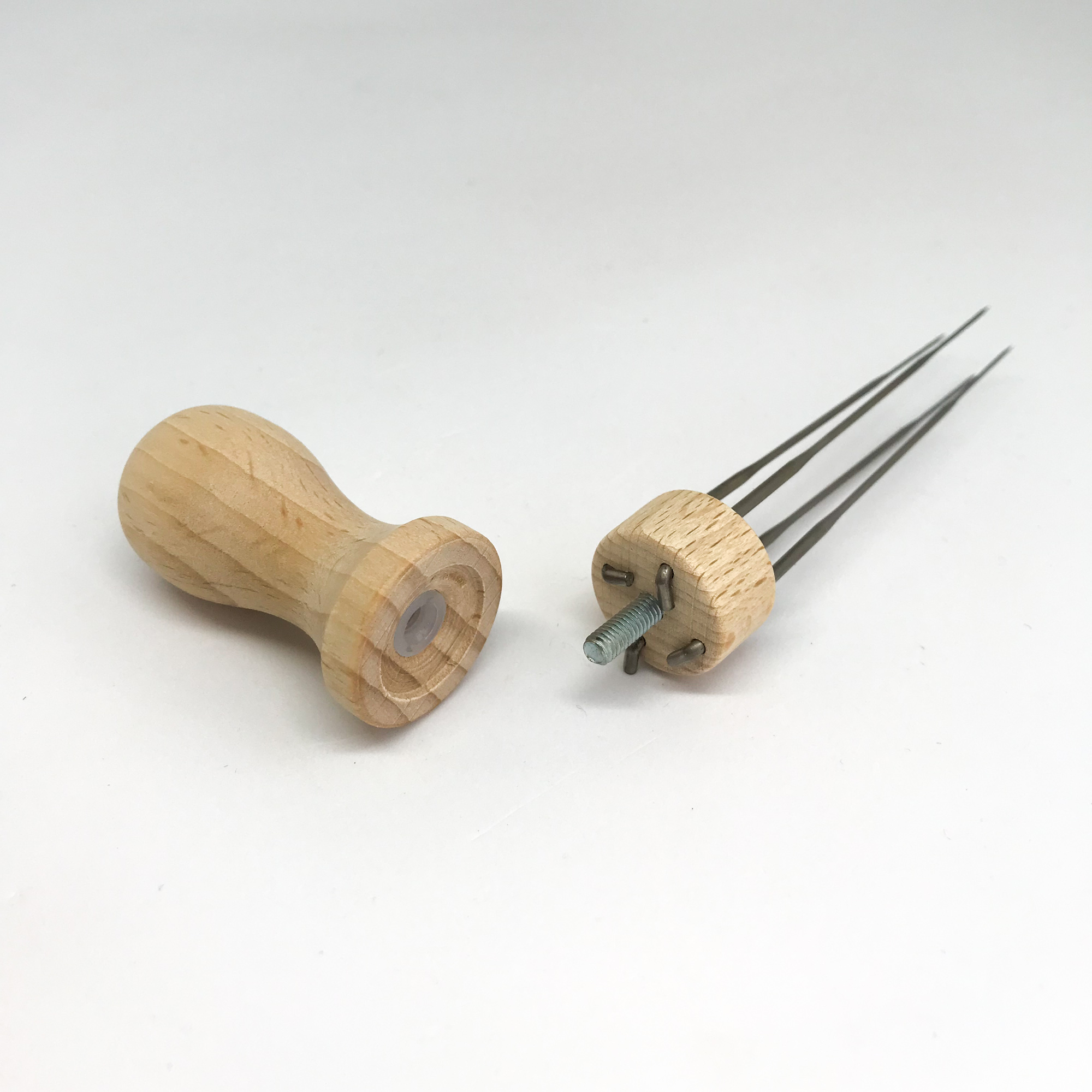 Nåleholder i tre til filtenåler. Nåleholderen gir et bedre grep når en nålefilter, og bruk av flere nåler gjør at arbeidet går fortere på større prosjekter. Kan brukes til inntil 4 nåler på en gang. Filtenåler kjøpes separat.