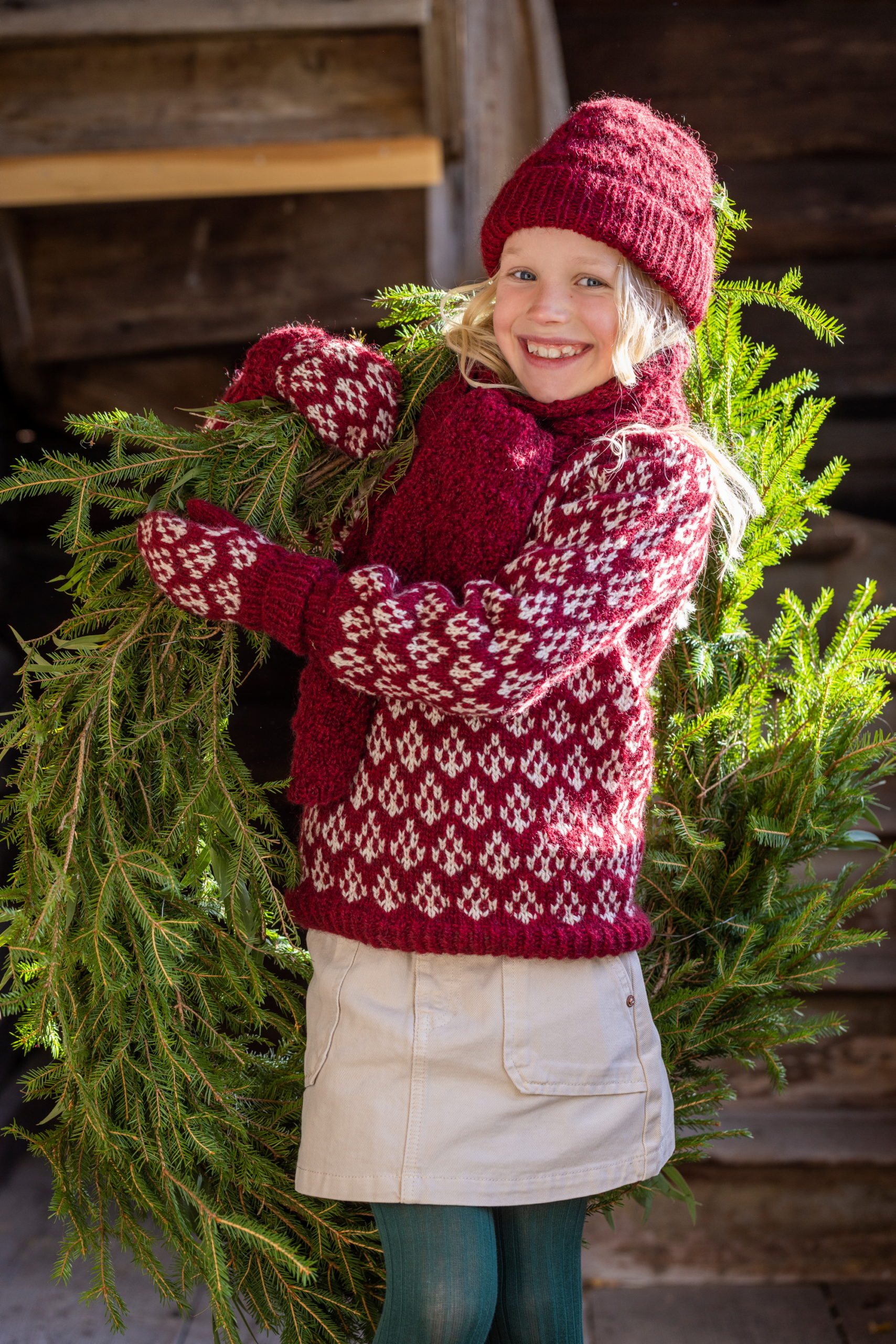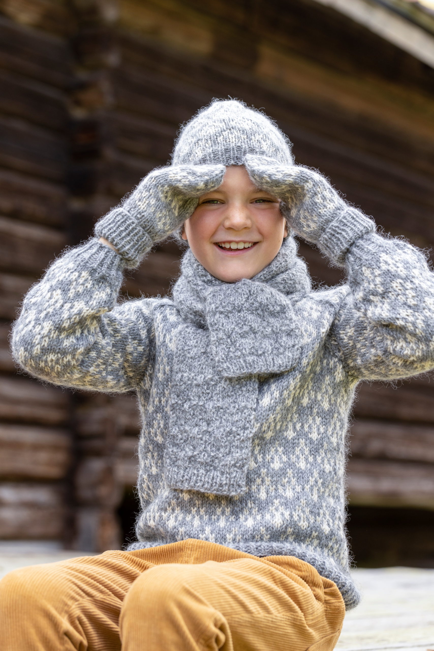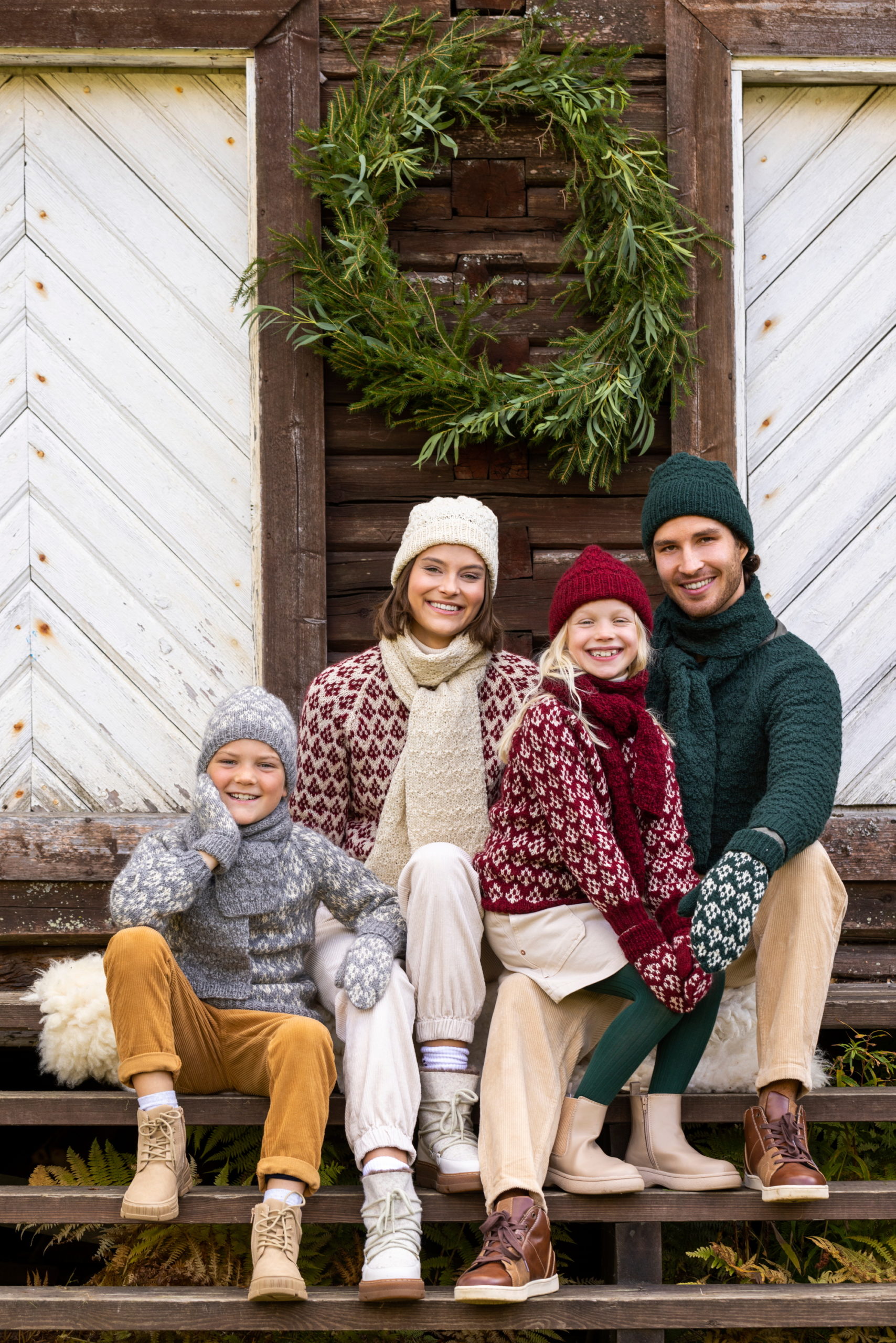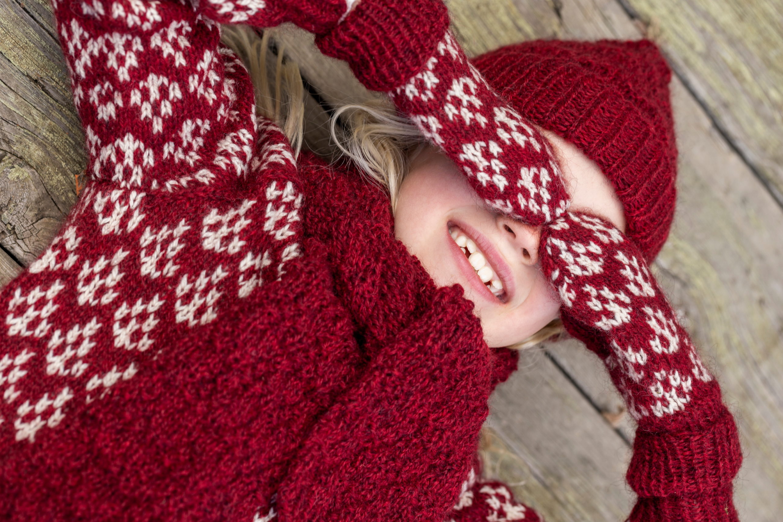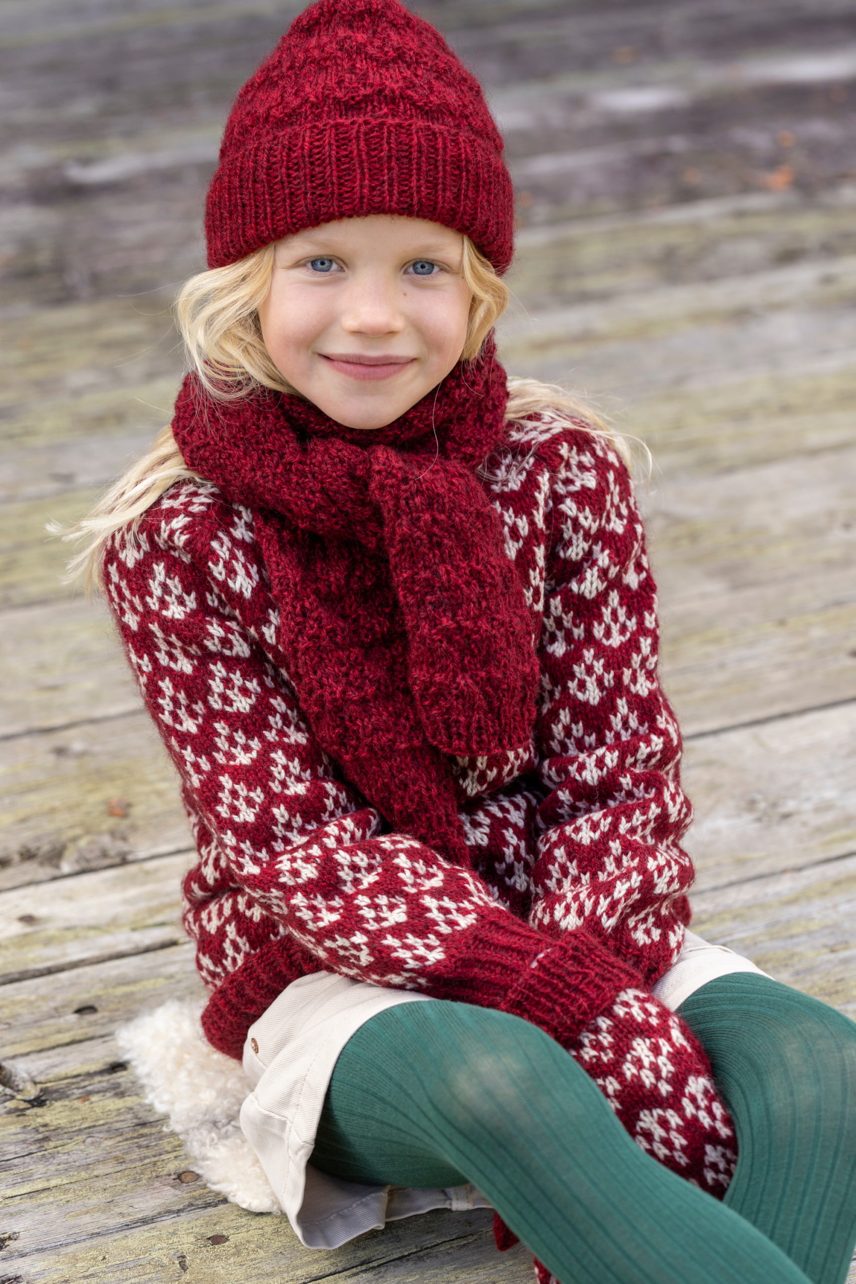 Strikket sett med votter, lue og sjal. Sjalet strikkes med struktur, vottene i tofarget mønster og luen kan strikkes med struktur eller mønster. Dersom du ønsker det kan du også strikke sjalet i tofarget mønster, da kan du legge til en hespe med mønsterfargen.