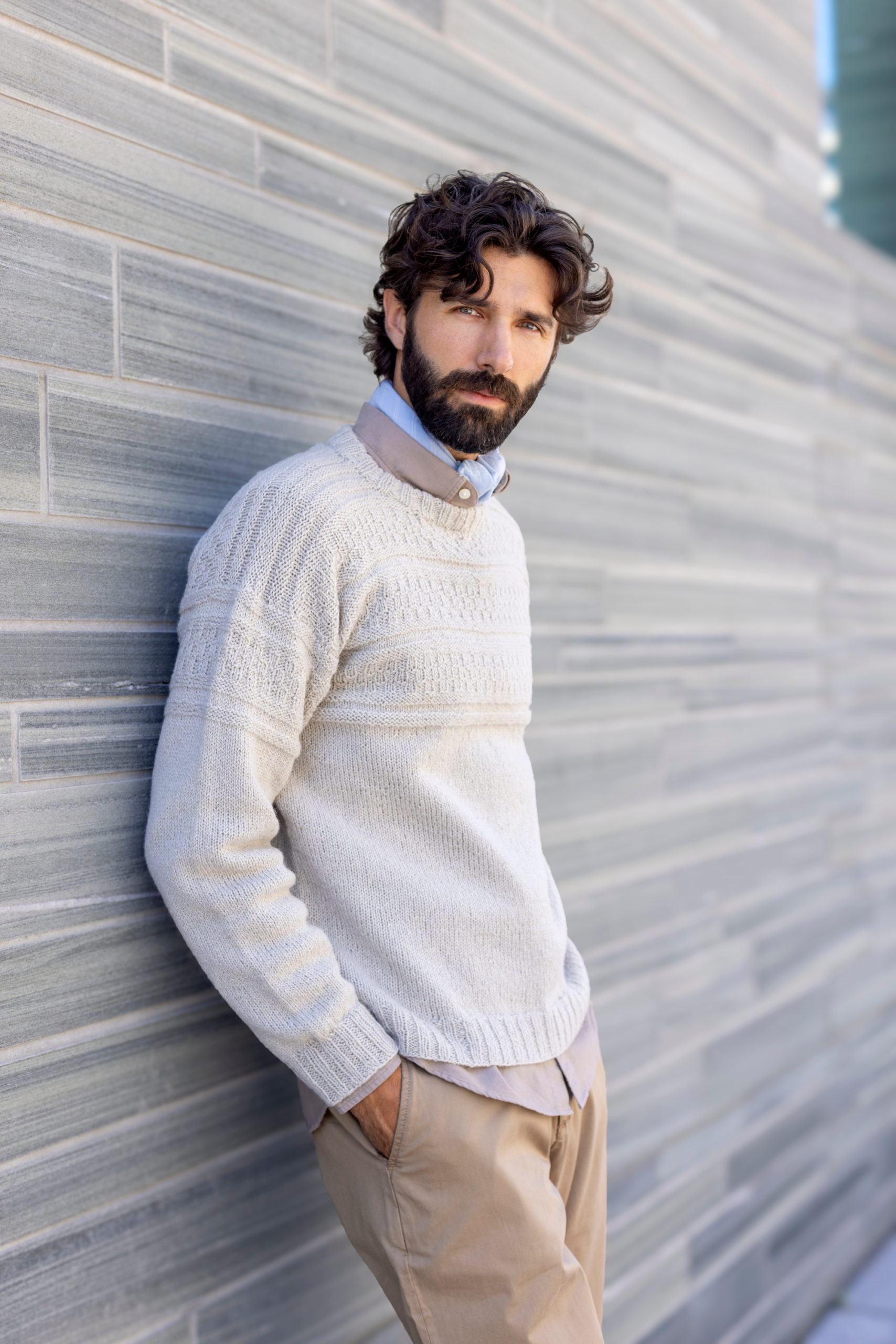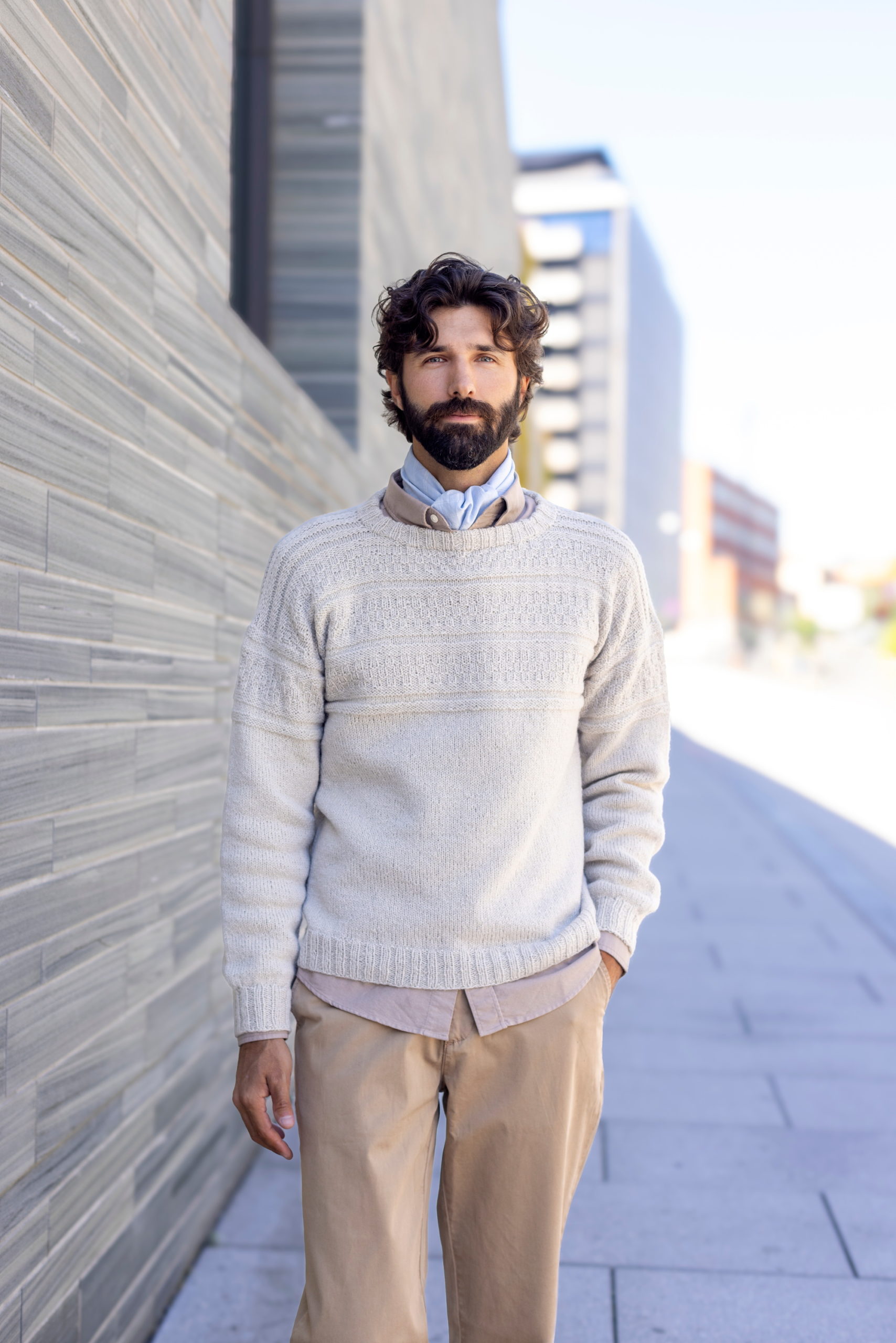 Nore genser strikkes i Ask ullgarn med glattstrikket bol og strukturmønstret bærestykke. Genseren strikkes nedenfra og opp og ermene strikkes ovenfra og ned. Genseren kan også strikkes i Sol lamullgarn eller Tinde pelsullgarn.