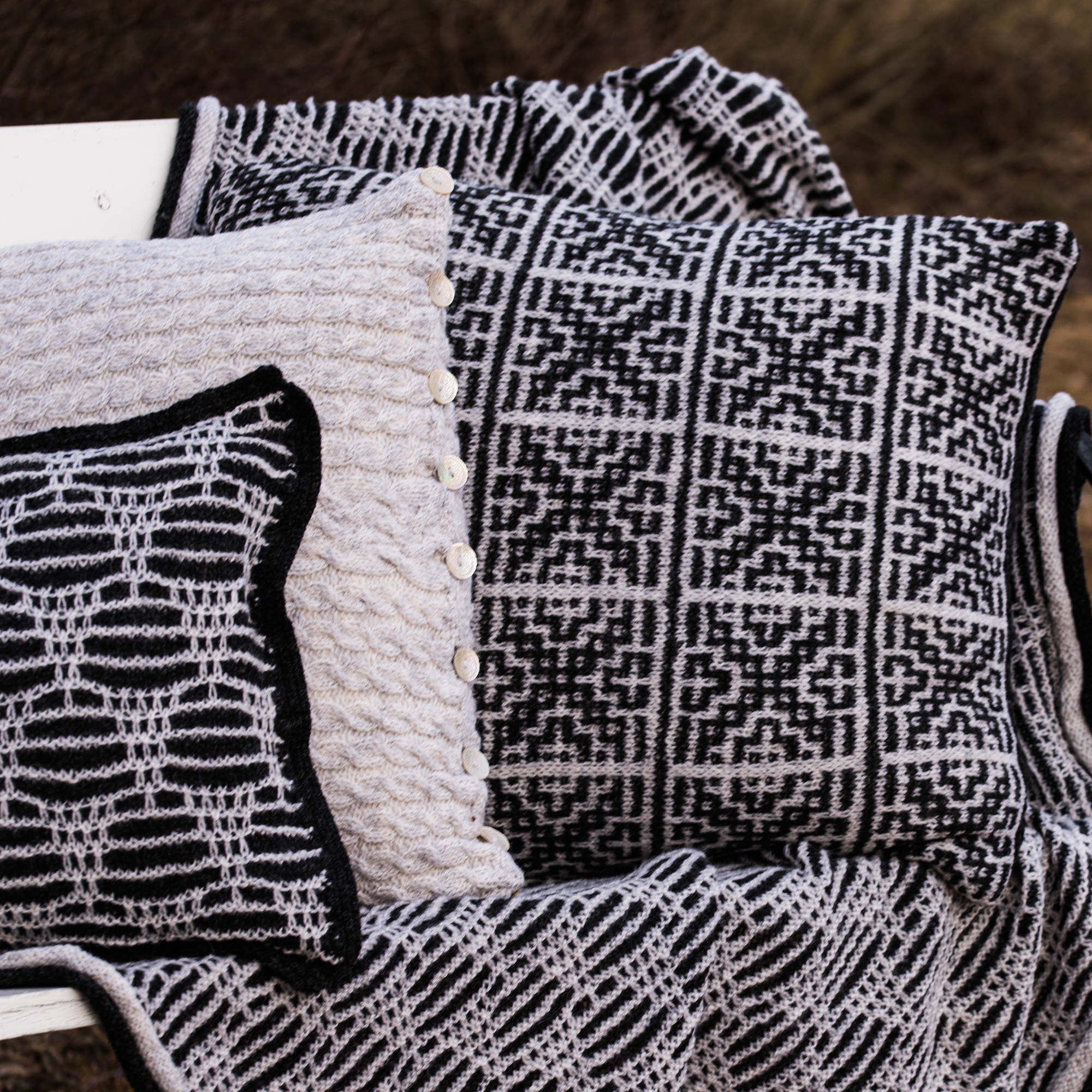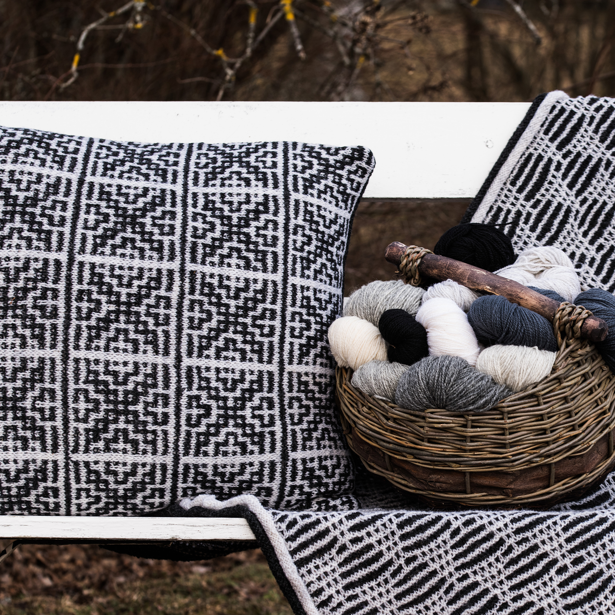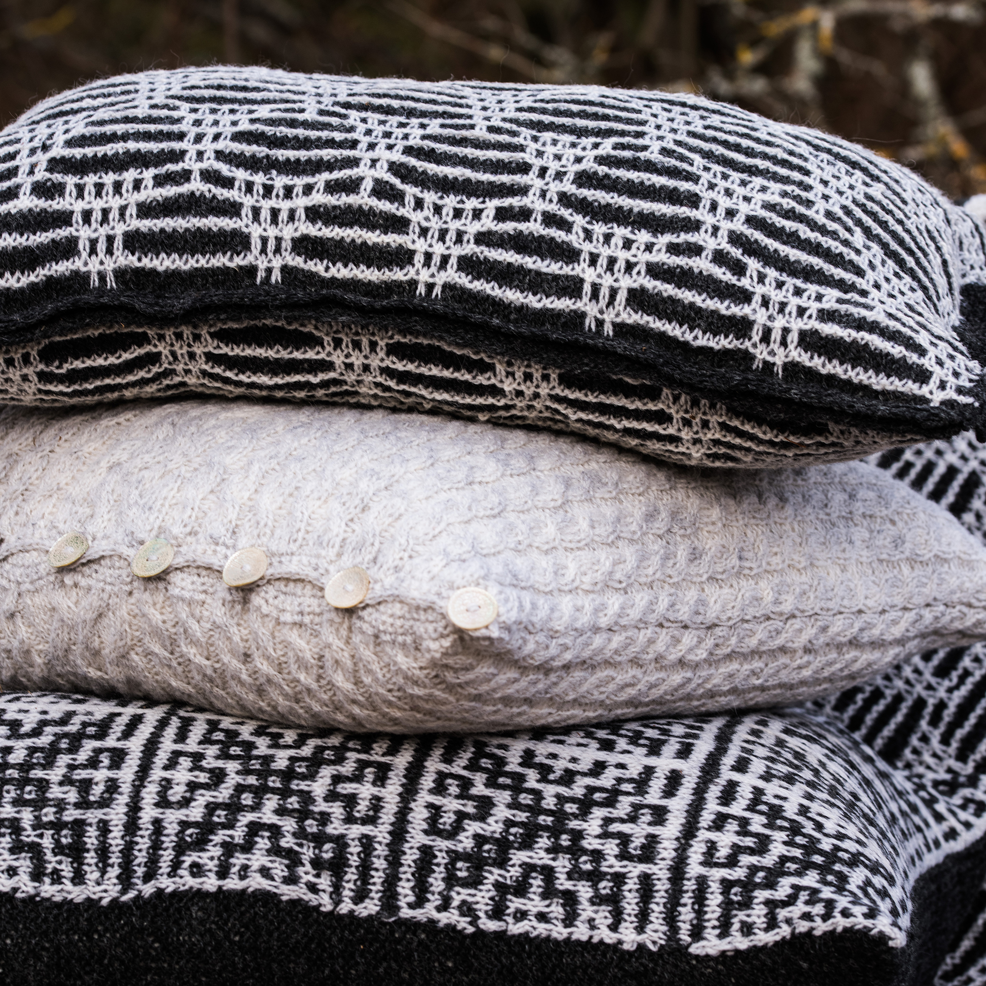 Nosok puter og pledd strikkes i Ask ullgarn. Garnpakken inneholder oppskrift og garn nok til hele settet.