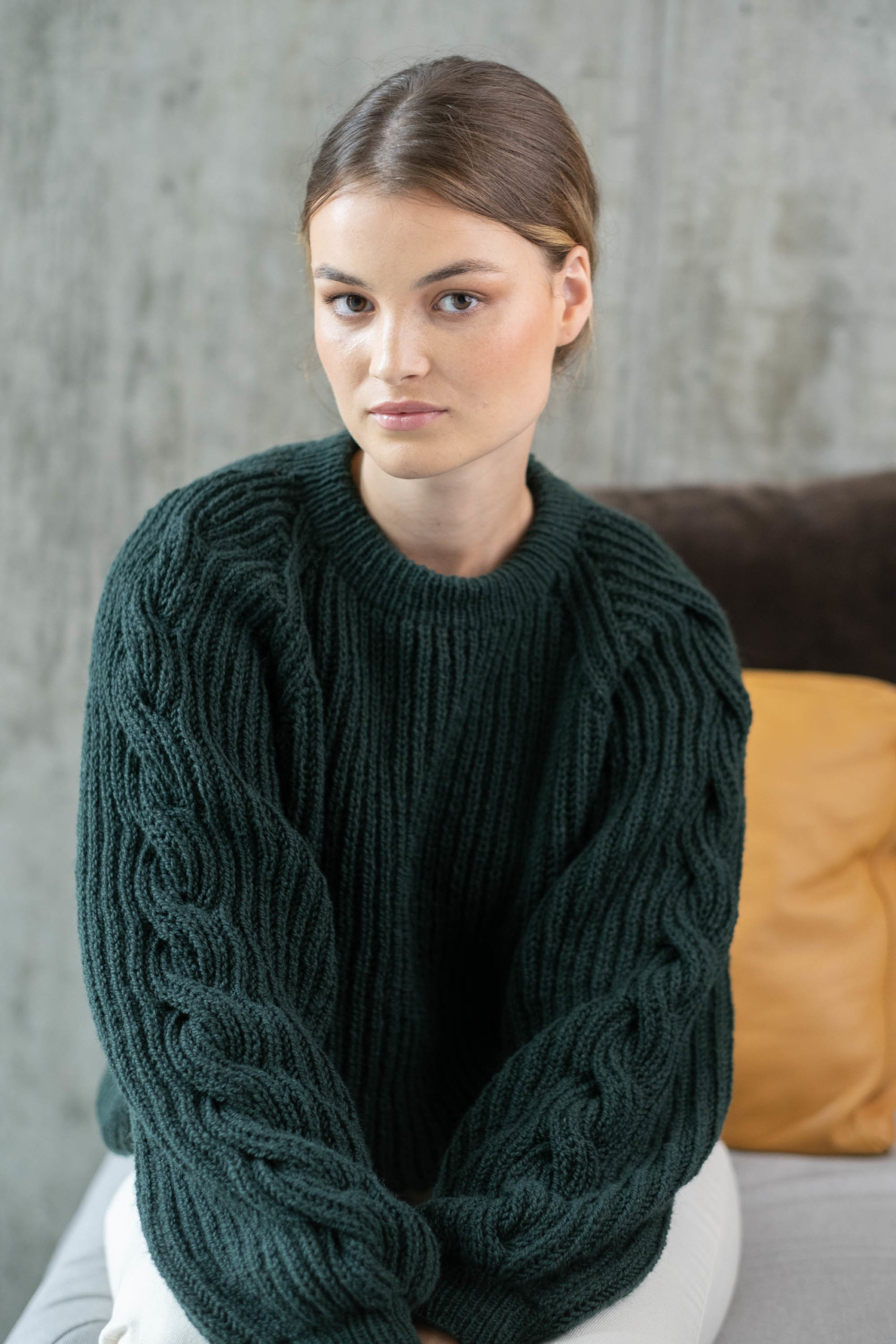 Patentstrikket genser med raglan og fletter langs ermene.