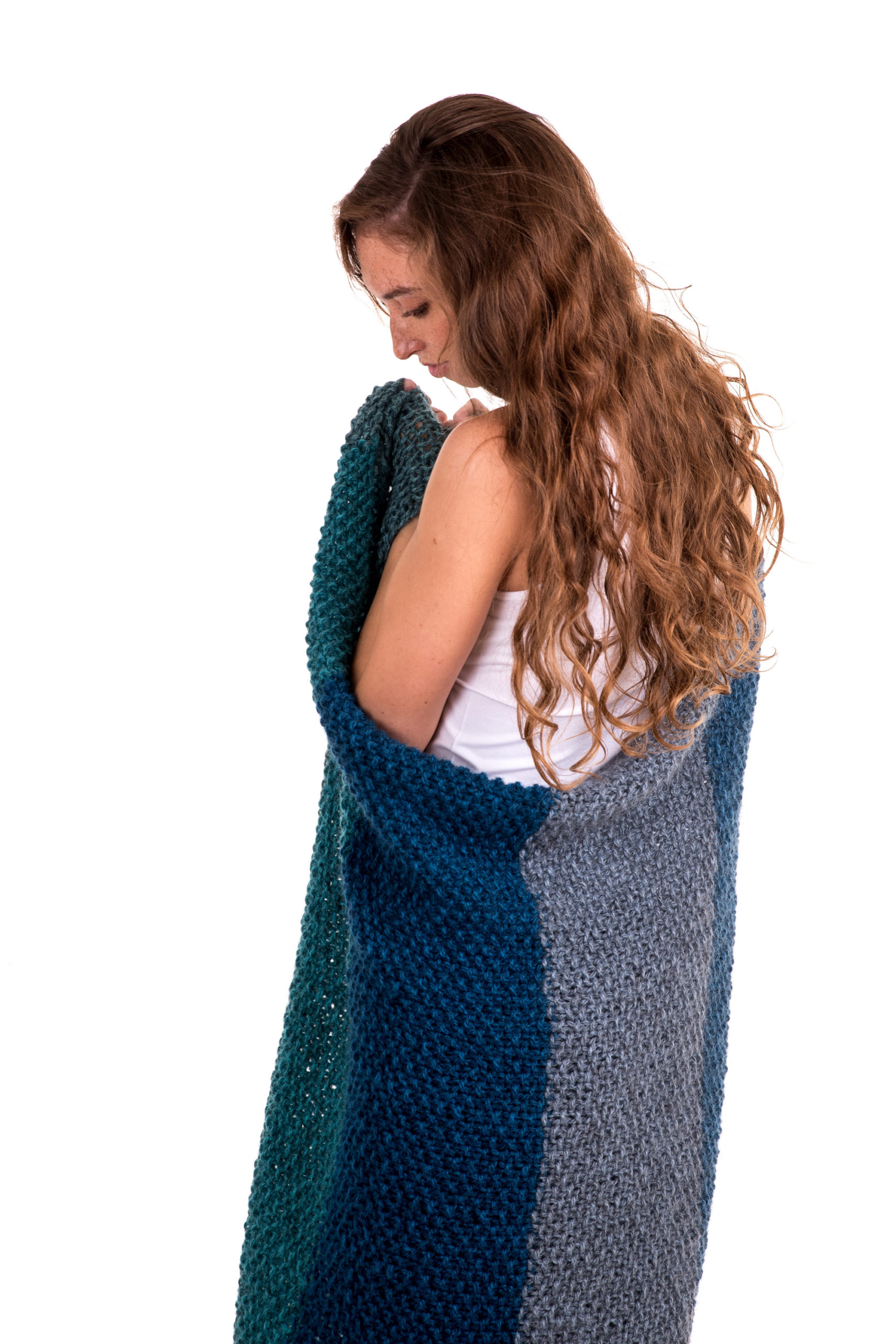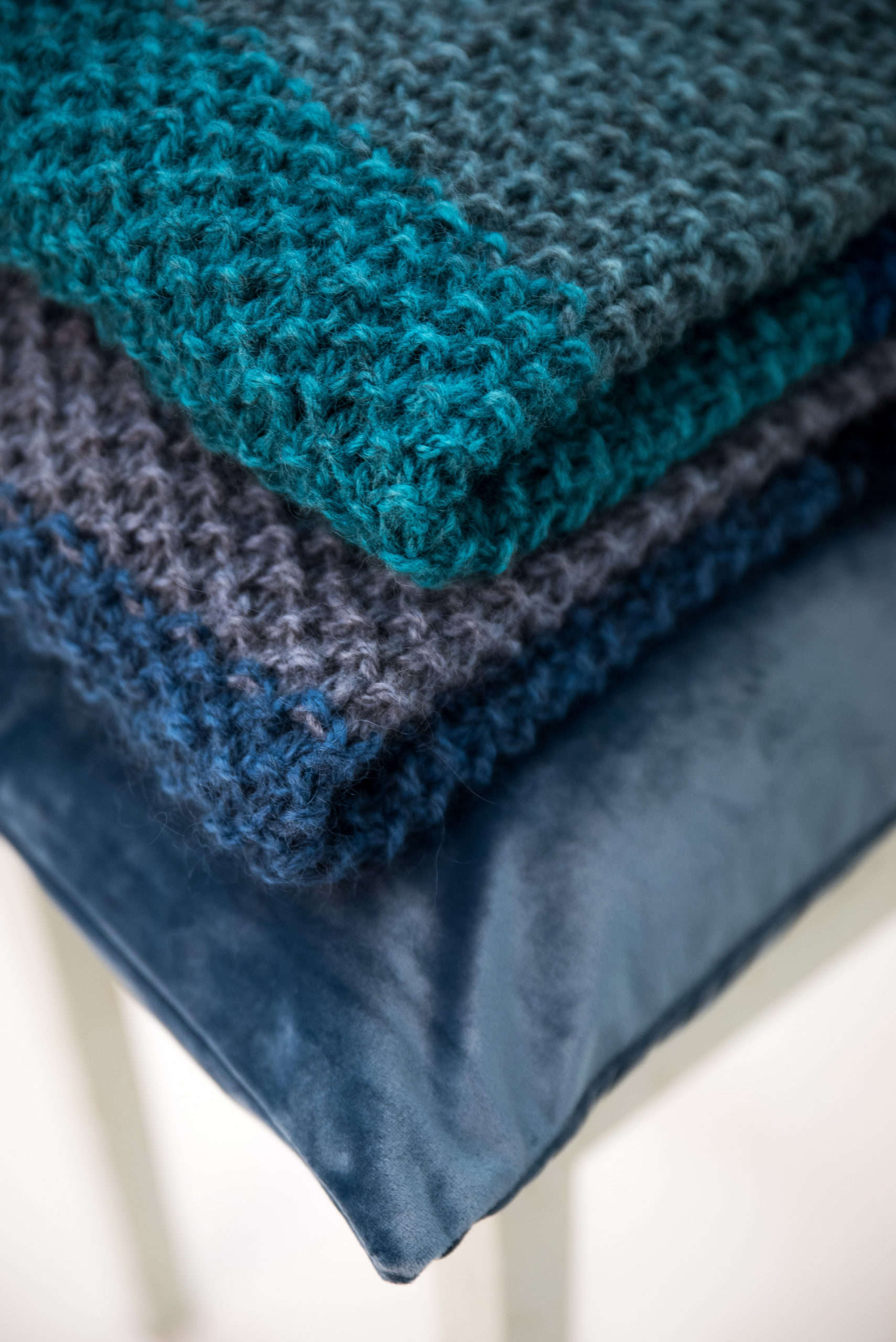 Perlestrikket pledd med blokkstriper i Blåne pelsullgarn. Pleddet er vist i 3 ulike varianter, velg de fargene du liker best.