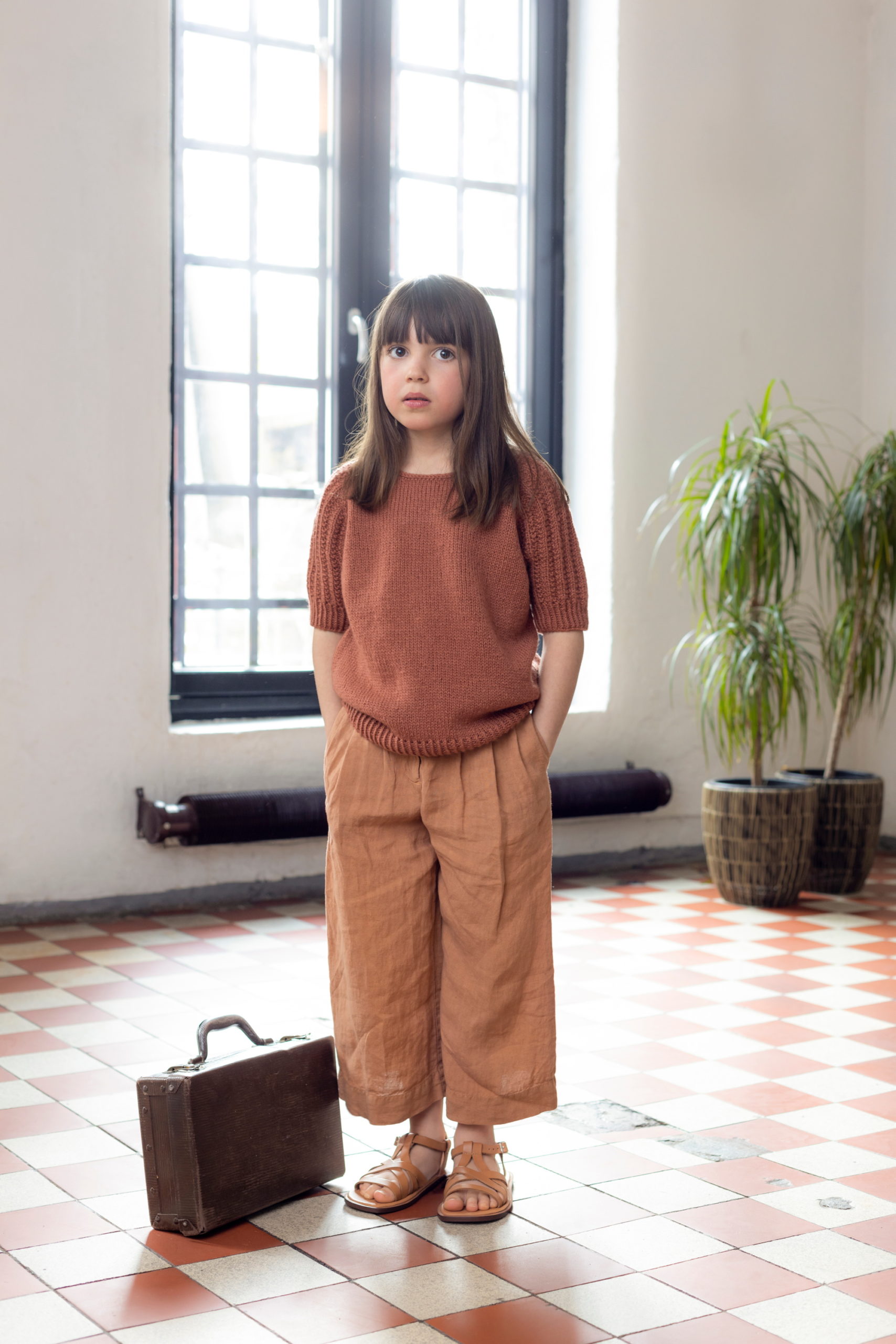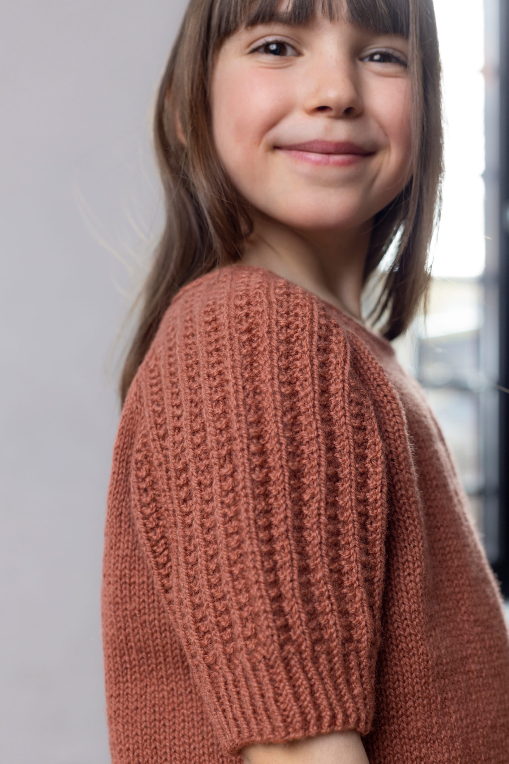 Kortermet topp til barn i glattstrikk, struktur og raglan. Toppen strikkes ovenfra og ned i Sol lamullgarn.