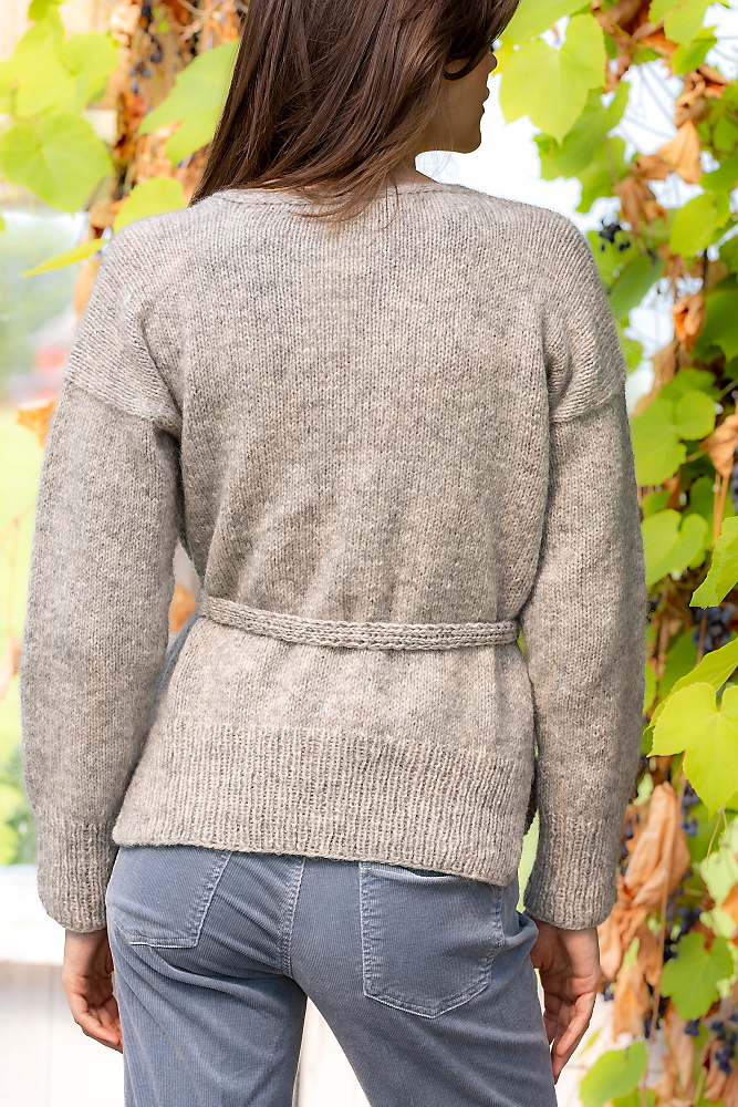 Enkel jakke med belte og splitt nede, samt dobbel forkant. Jakken strikkes nedenfra og opp.