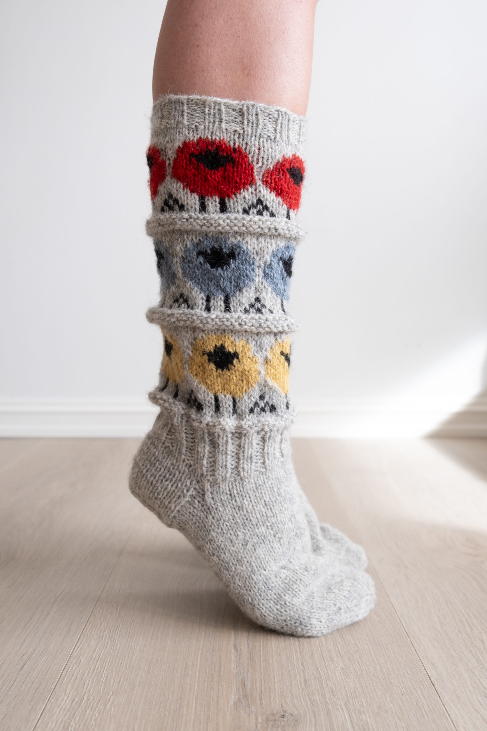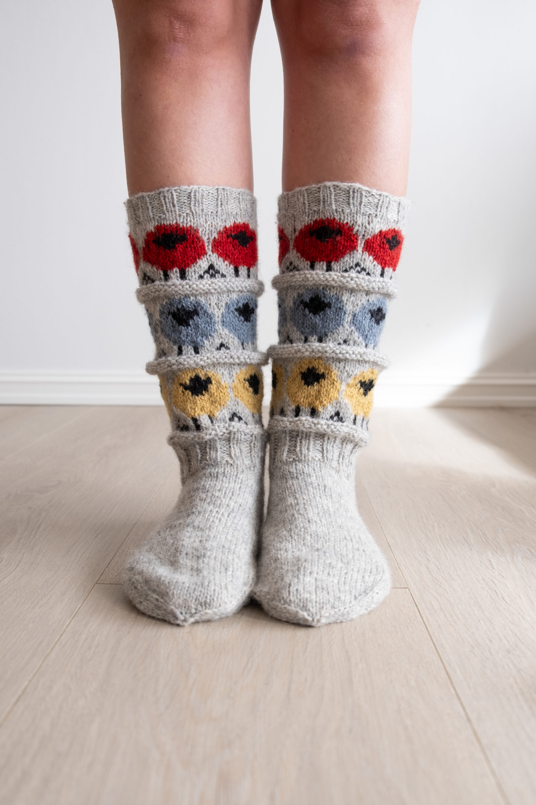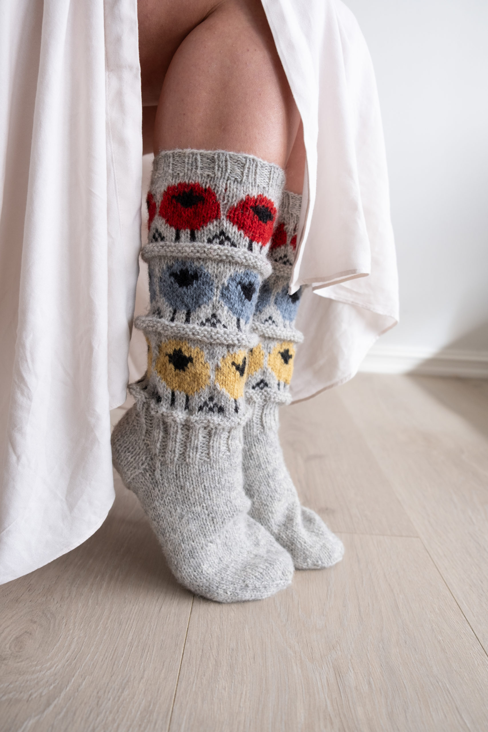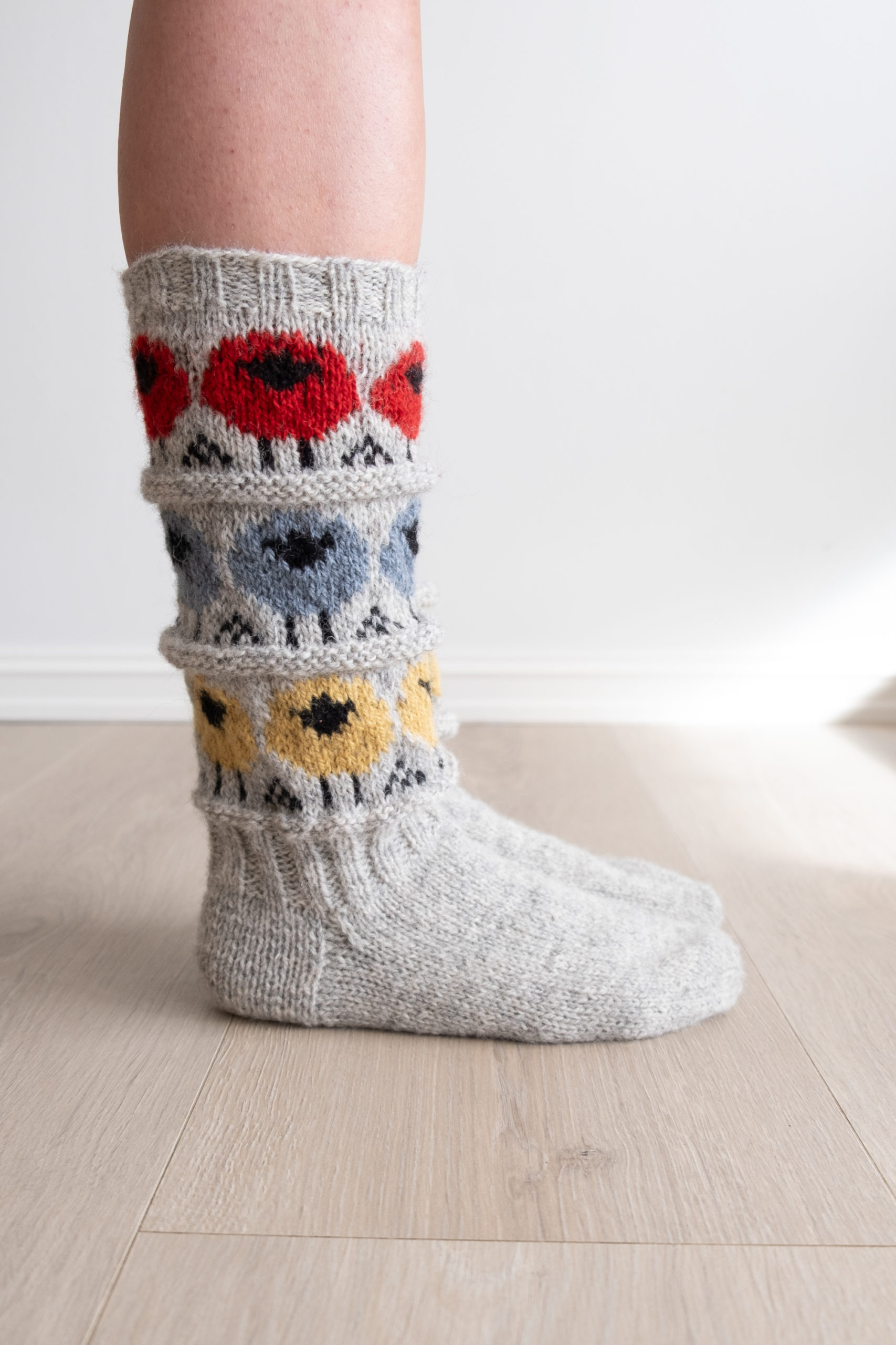 Strikkede sokker med sauer på. Strikkes ovenfra og ned med mønster etter diagram i Fjord Sokkegarn.
