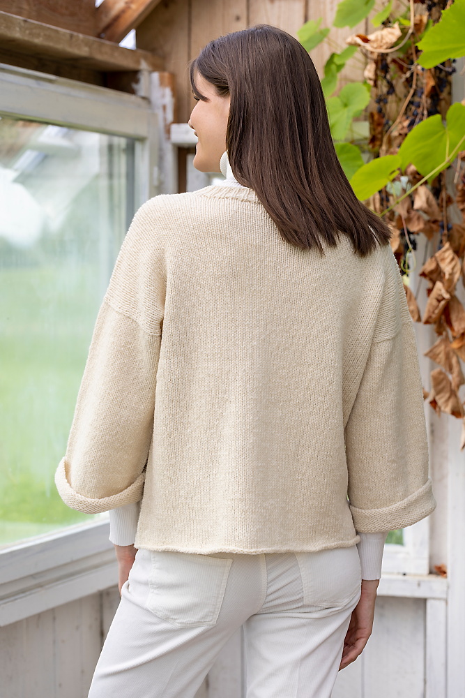 Enkel genser med V-hals og ¾ ermer med oppbrett. Rullekant nede på bol og nede på ermer. Genseren strikkes nedenfra og opp, ermene strikkes ovenfra og ned.