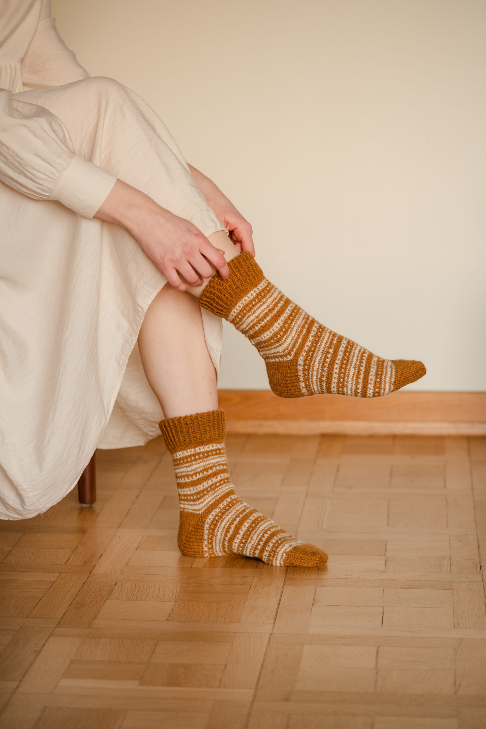 Sokker No 1 is knit in Fjære sokkegarn. The yarn kit contains a pattern and enough yarn for the largest size.