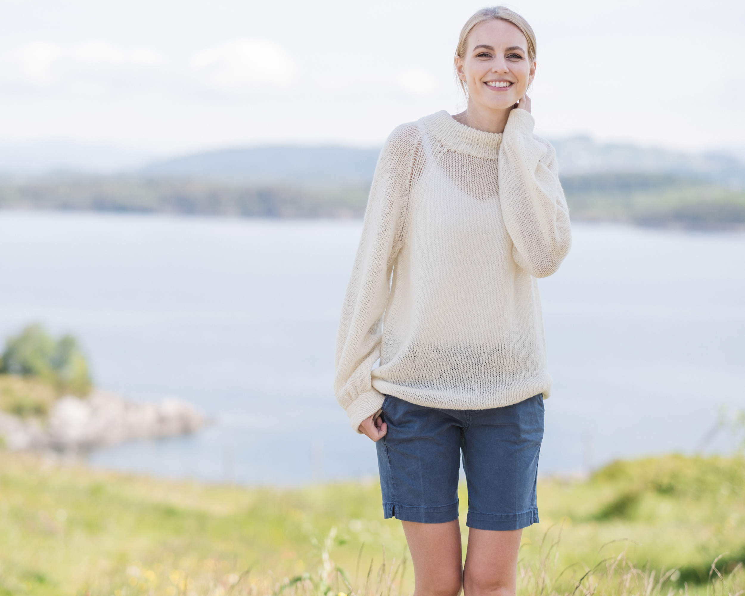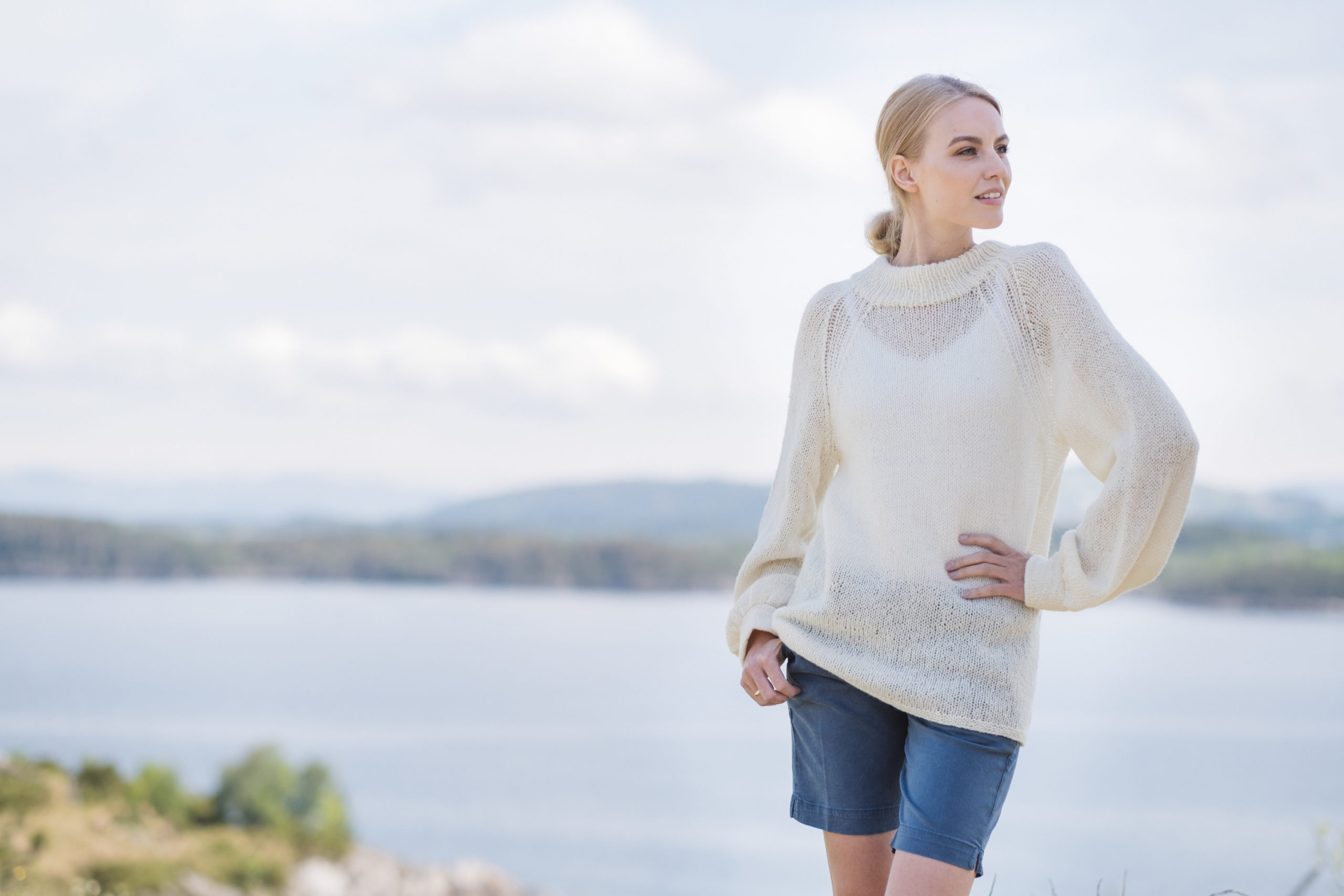 Glattstrikket genser med raglan. Genseren er strikket på tykke pinner, mens kanten på ermer og bol strikkes på tynnere pinner. Dette gjør den luftig og lett.