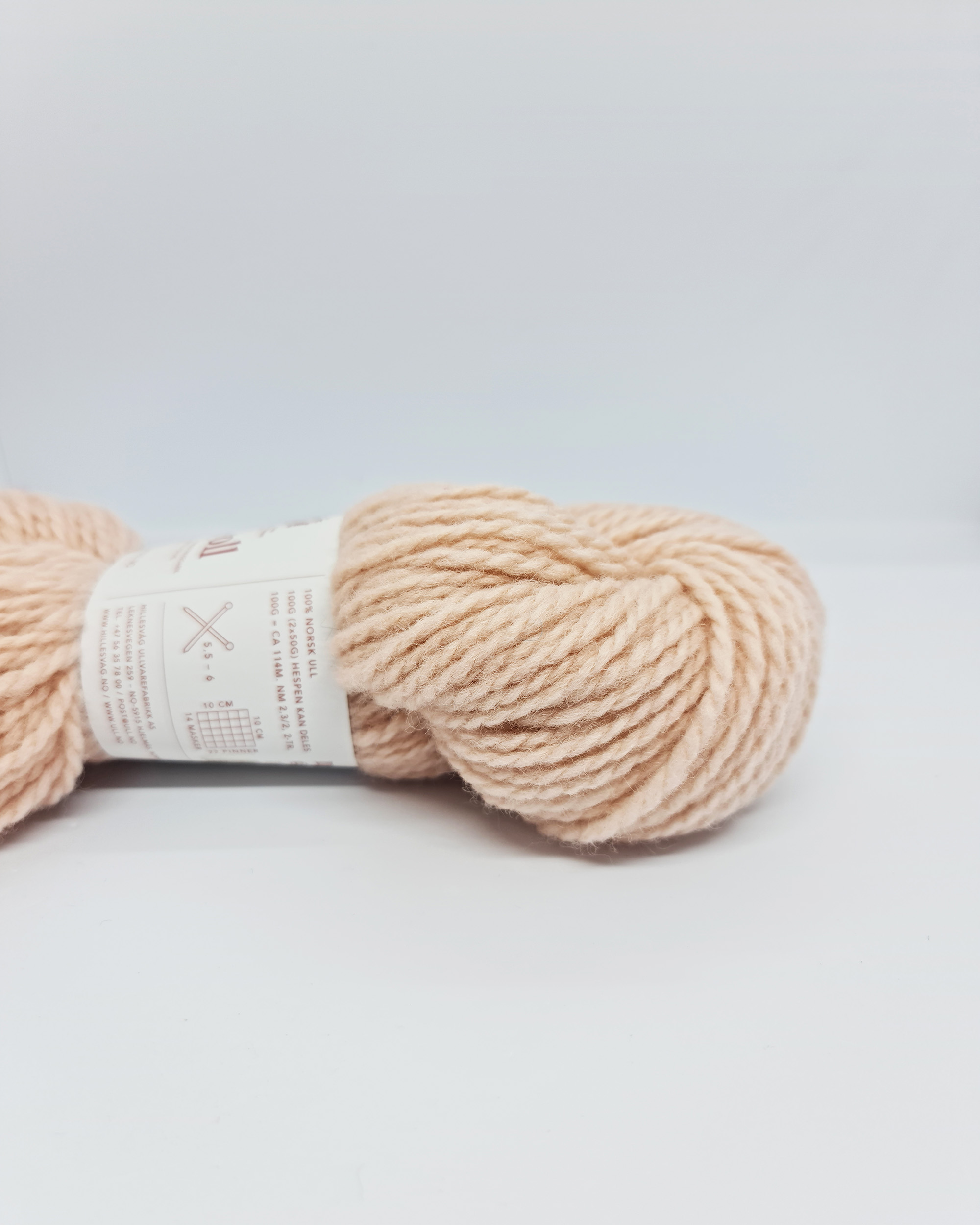 Ca. 114 m pr. 100 g, Nm 2,3/2, 100% norsk ull. Pinner 5.5 – 6 mm.