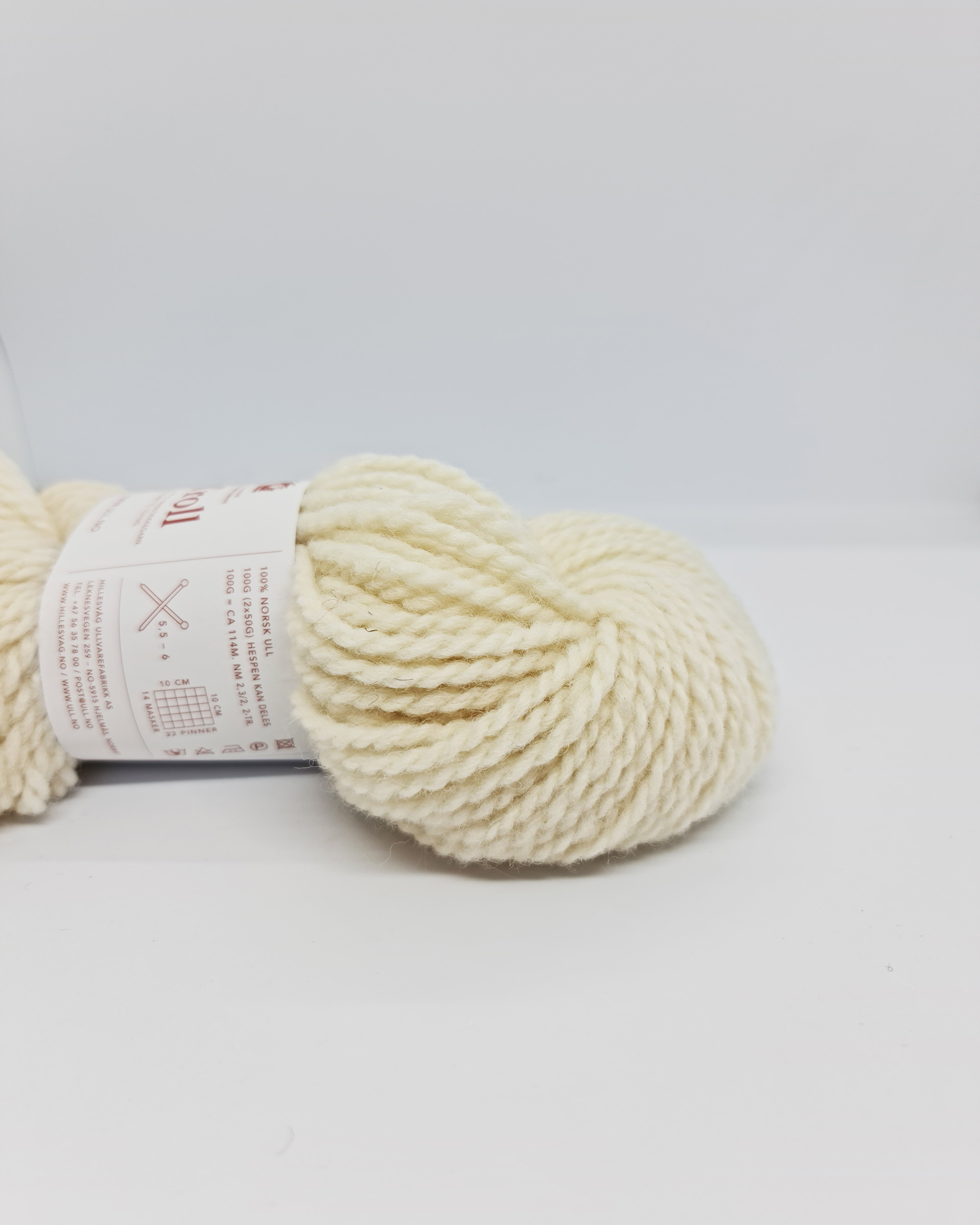 Ca. 114 m pr. 100 g, Nm 2,3/2, 100% norsk ull. Pinner 5.5 – 6 mm.