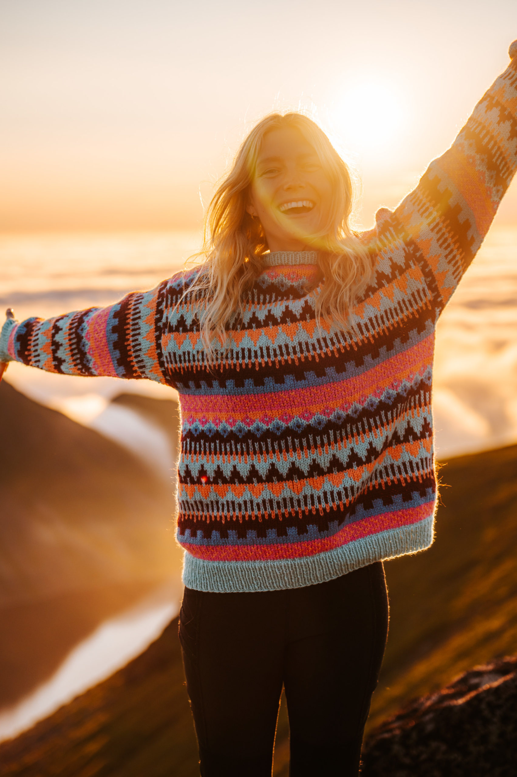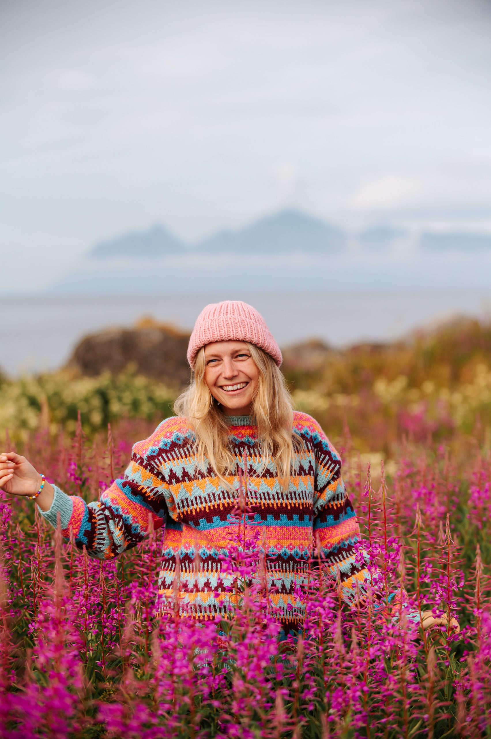 Denne genseren er oversized og har en anbefalt bevegelsesvidde på ca 15-20 cm. Merk at skulderen faller et stykke ned på ermet og er med på å danne lengden på ermet. Du kan selvsagt strikke den mer tettsittende eller løsere etter eget ønske.
