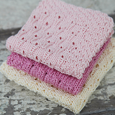 Vaskeklutene strikkes i Luxor bomullsgarn. Garnforbruk: 50 G pr vaskeklut.