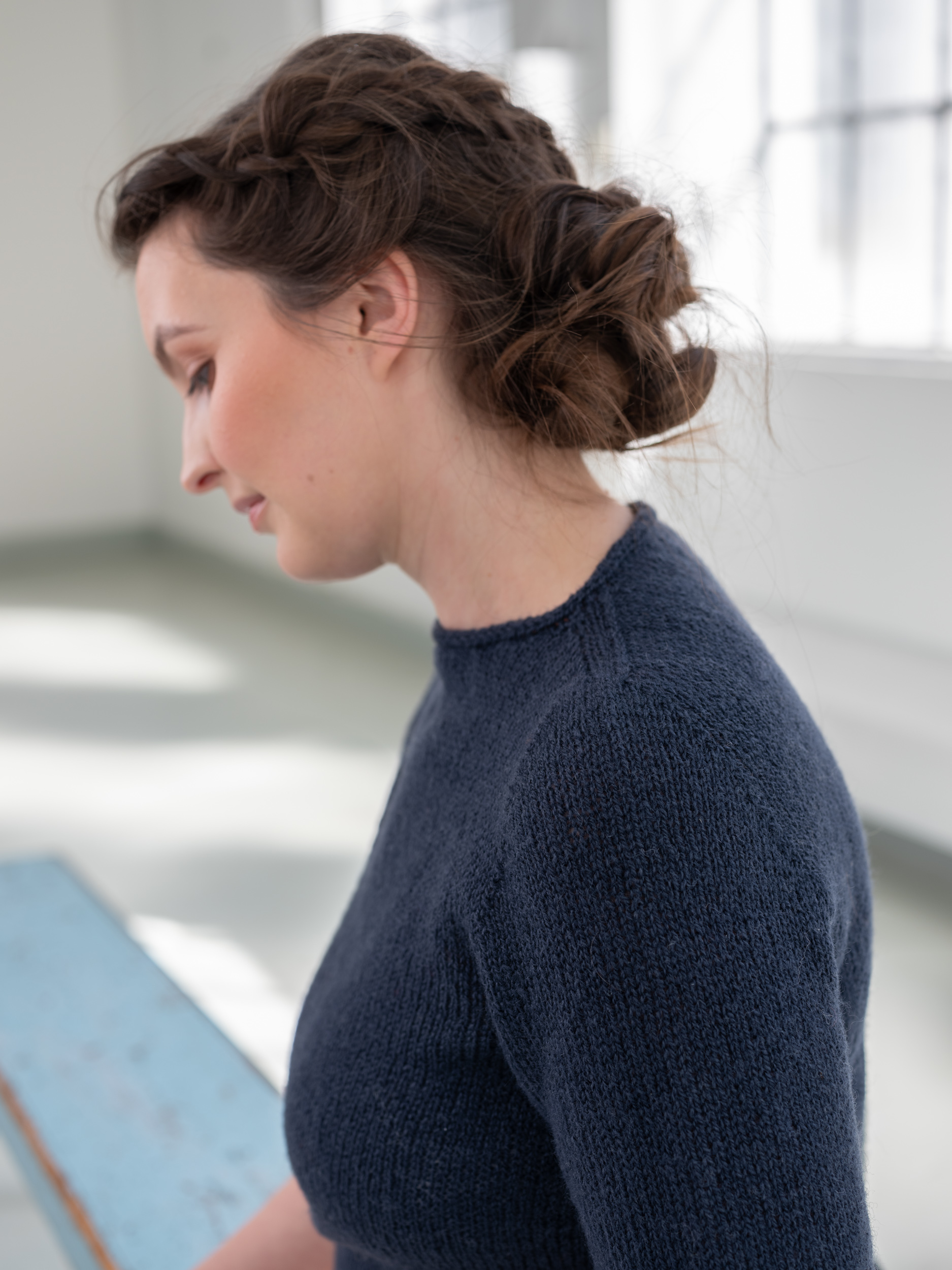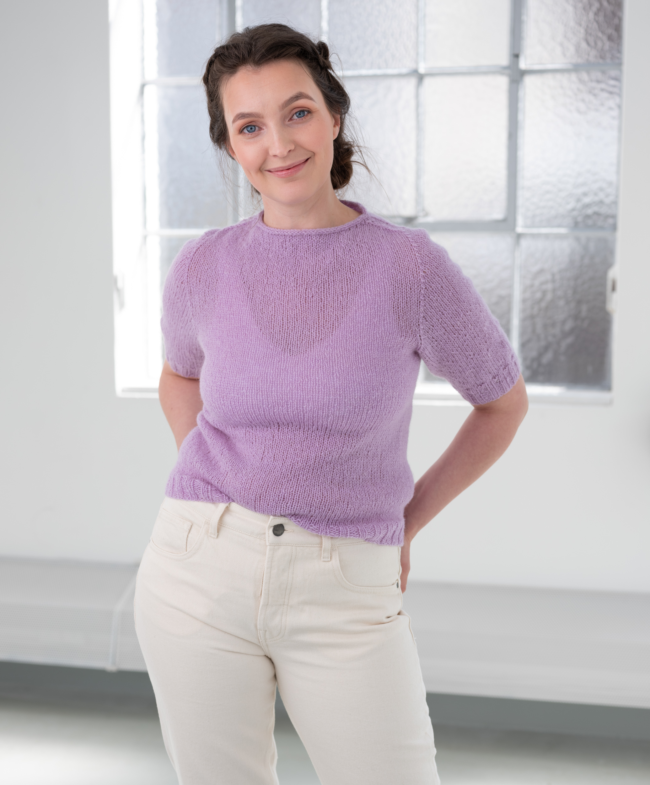 Kortermet genser/t-skjorte i glattstrikk i Ask Ullgarn. Genseren strikkes nedenfra og opp med sadelskuldre og i-cord i halskant.
